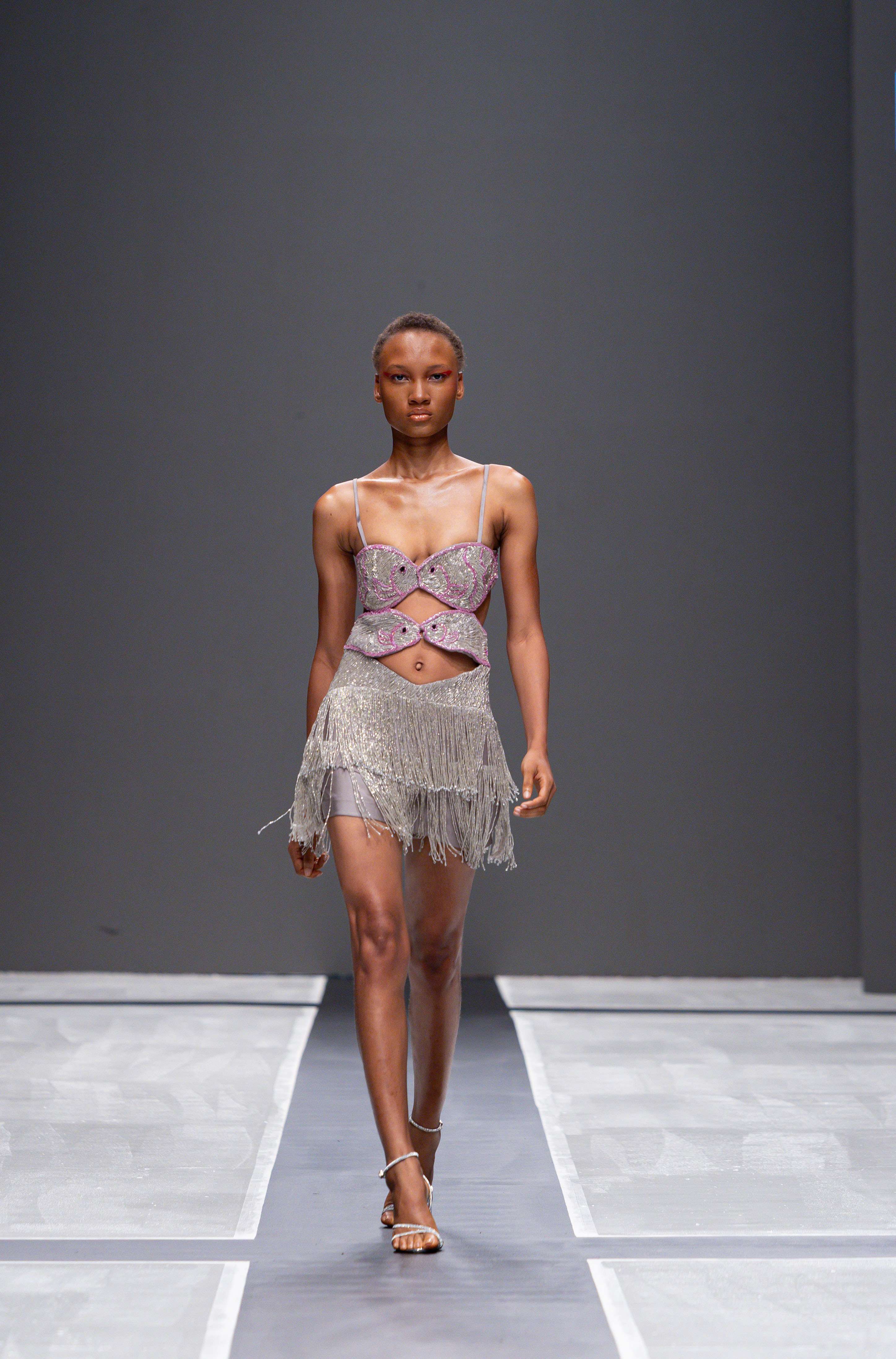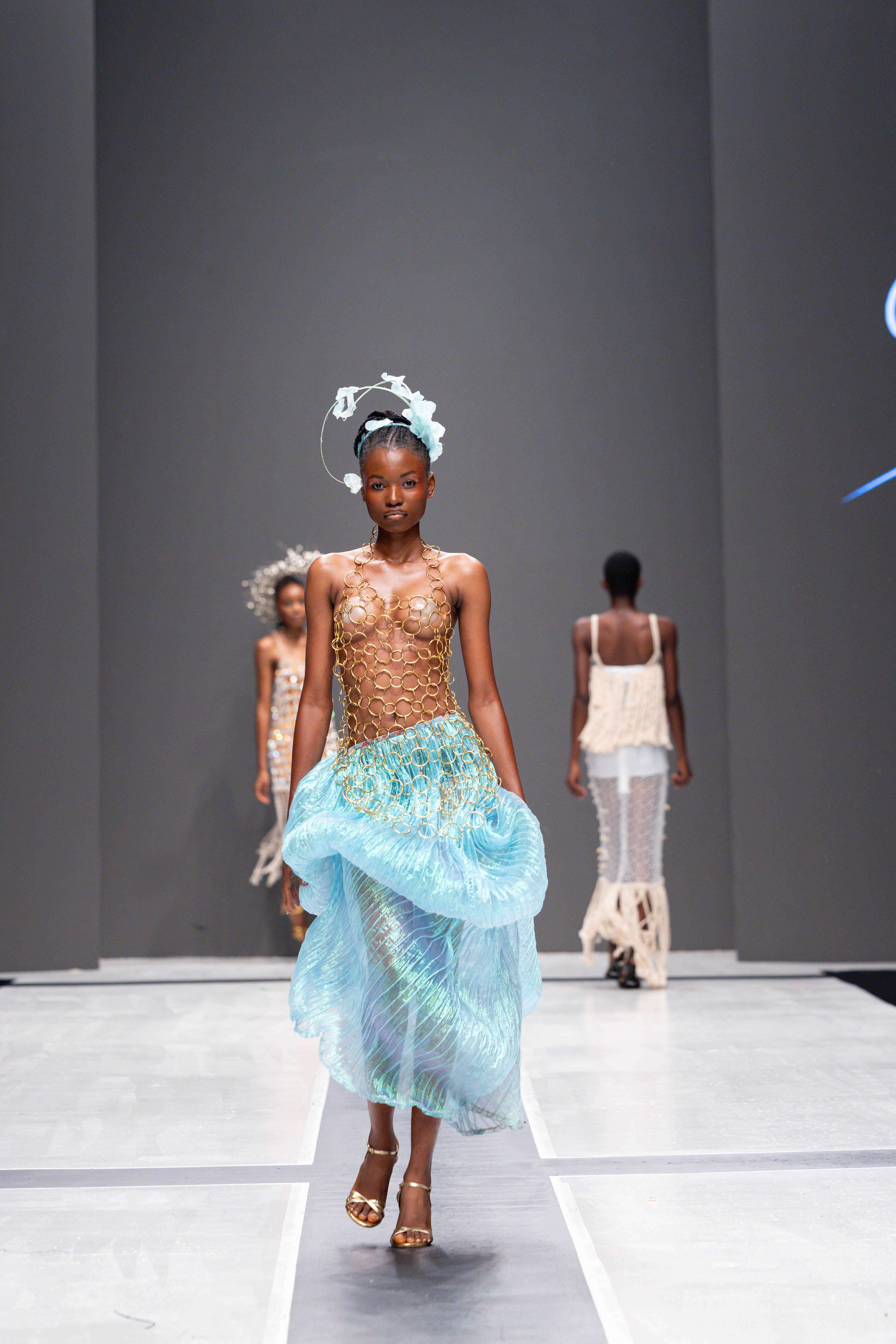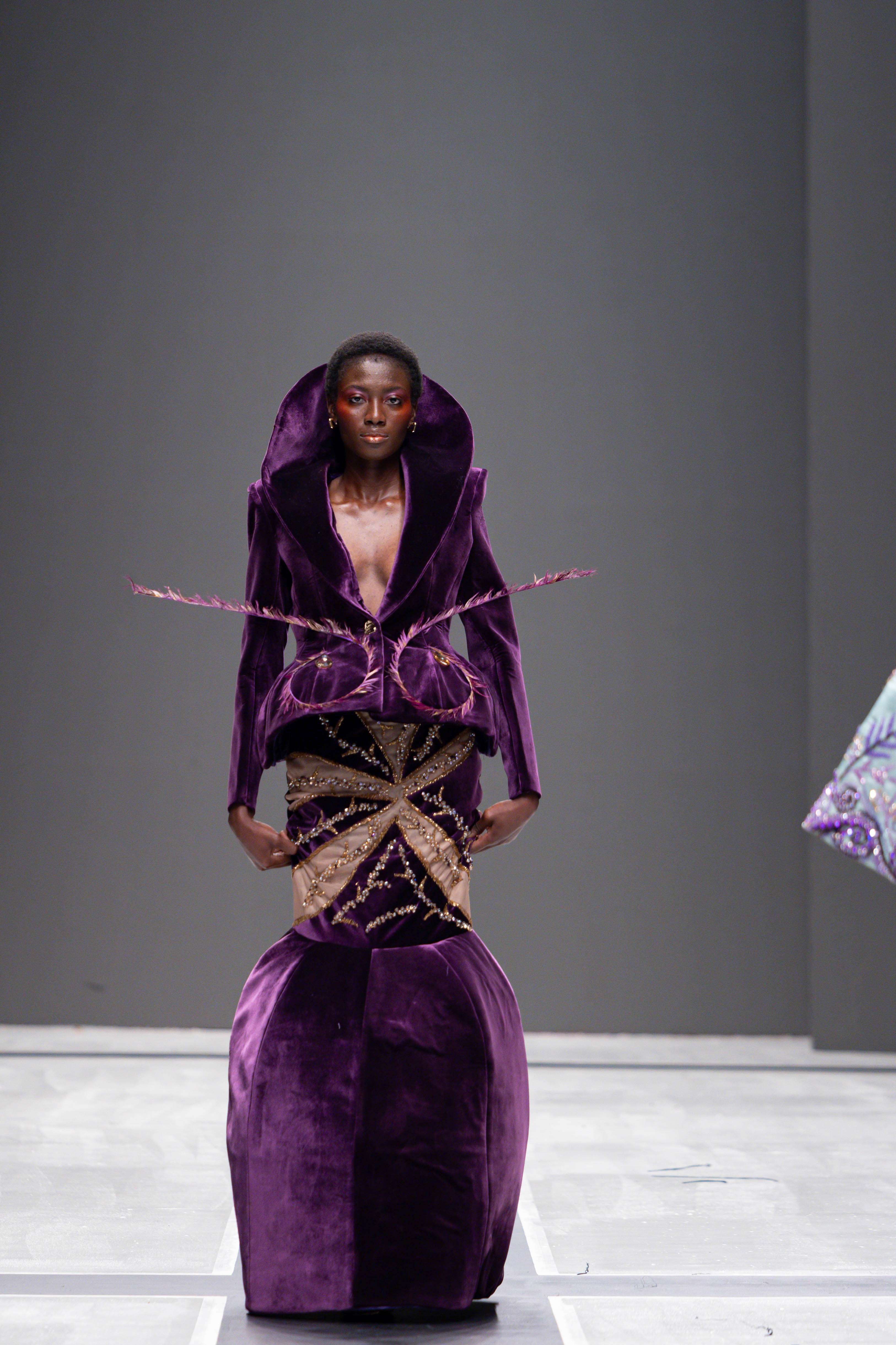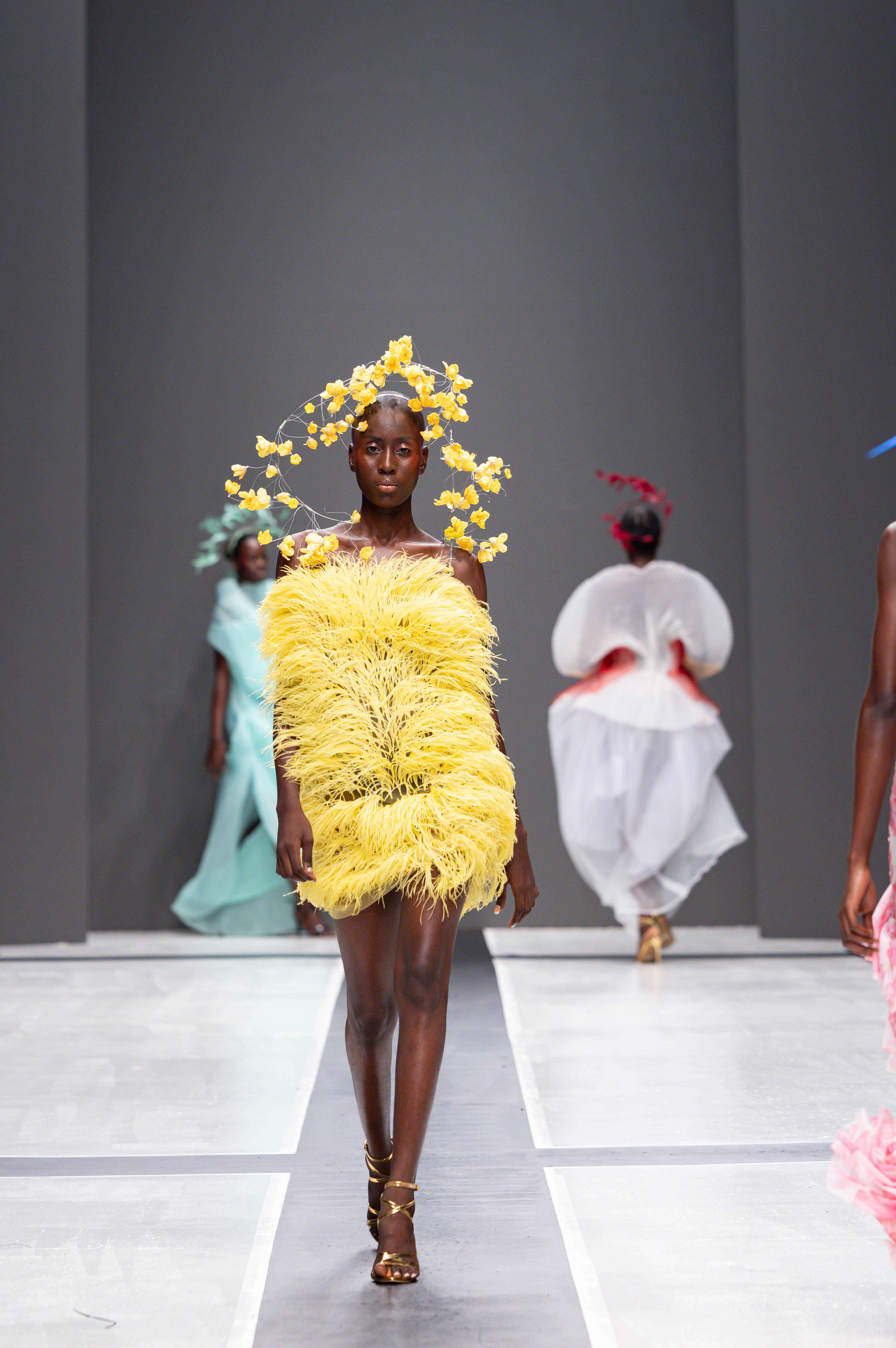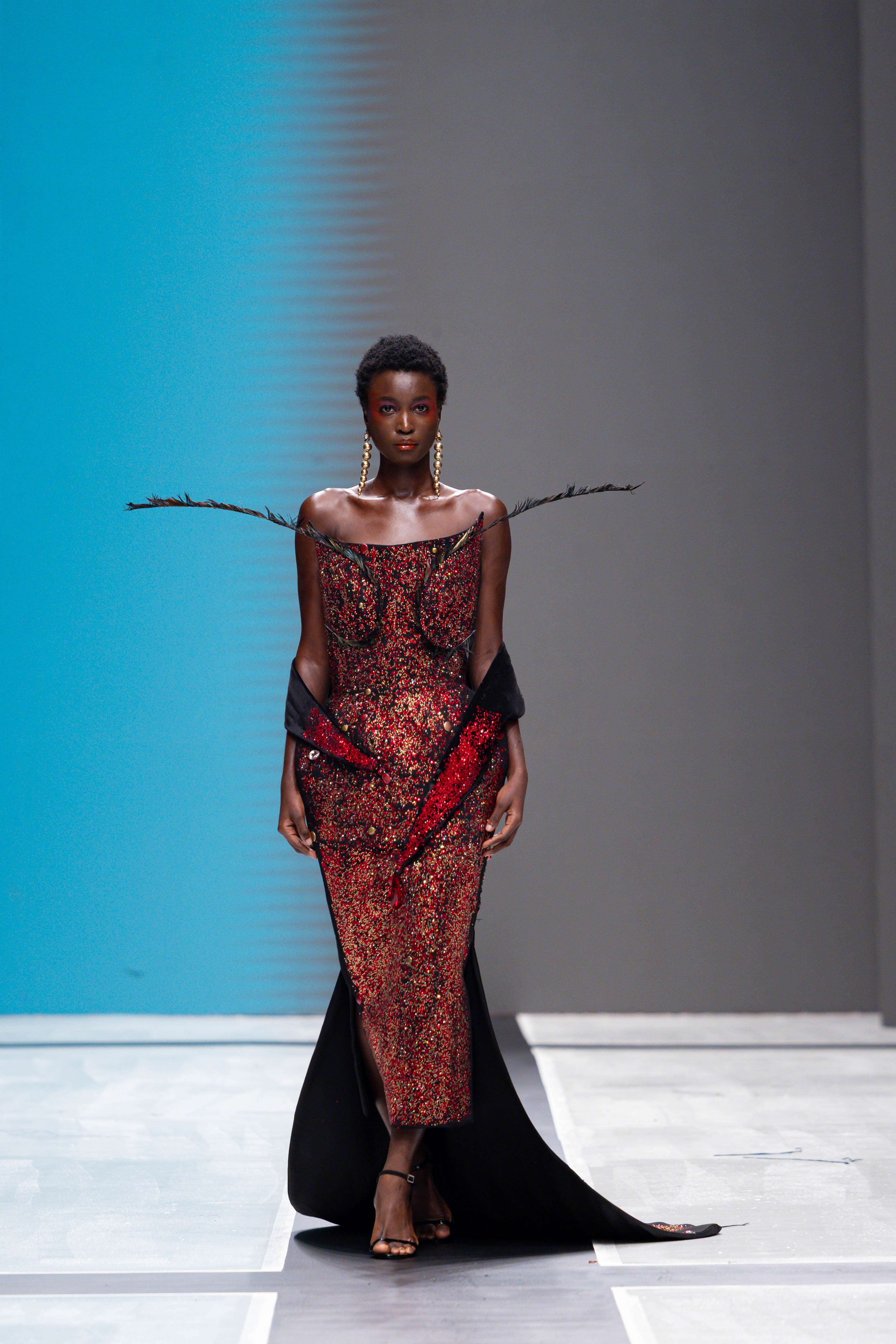 The show opened with Sevon Dejana, whose collection featured bold silhouettes that embodied feminine strength. The couture-inflected designs shimmered with intricate beaded cascades and sculptural lines, capturing the audience’s attention from the first look. Following this, Ibilola Ogundipe offered a softer take on womanhood, presenting flowing fabrics and feather accents that danced gracefully, reminiscent of moving water, while corseted details added a touch of elegance.