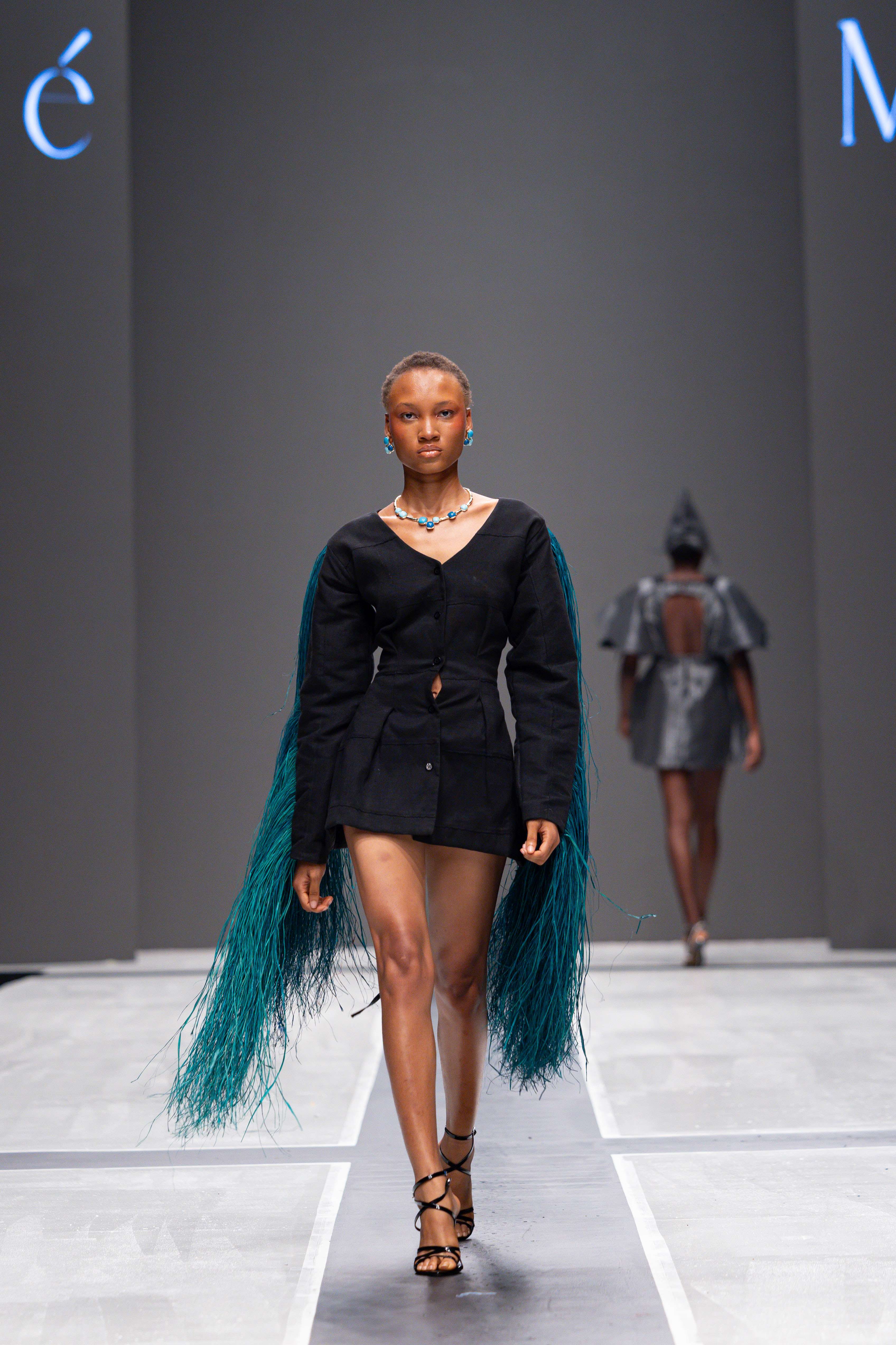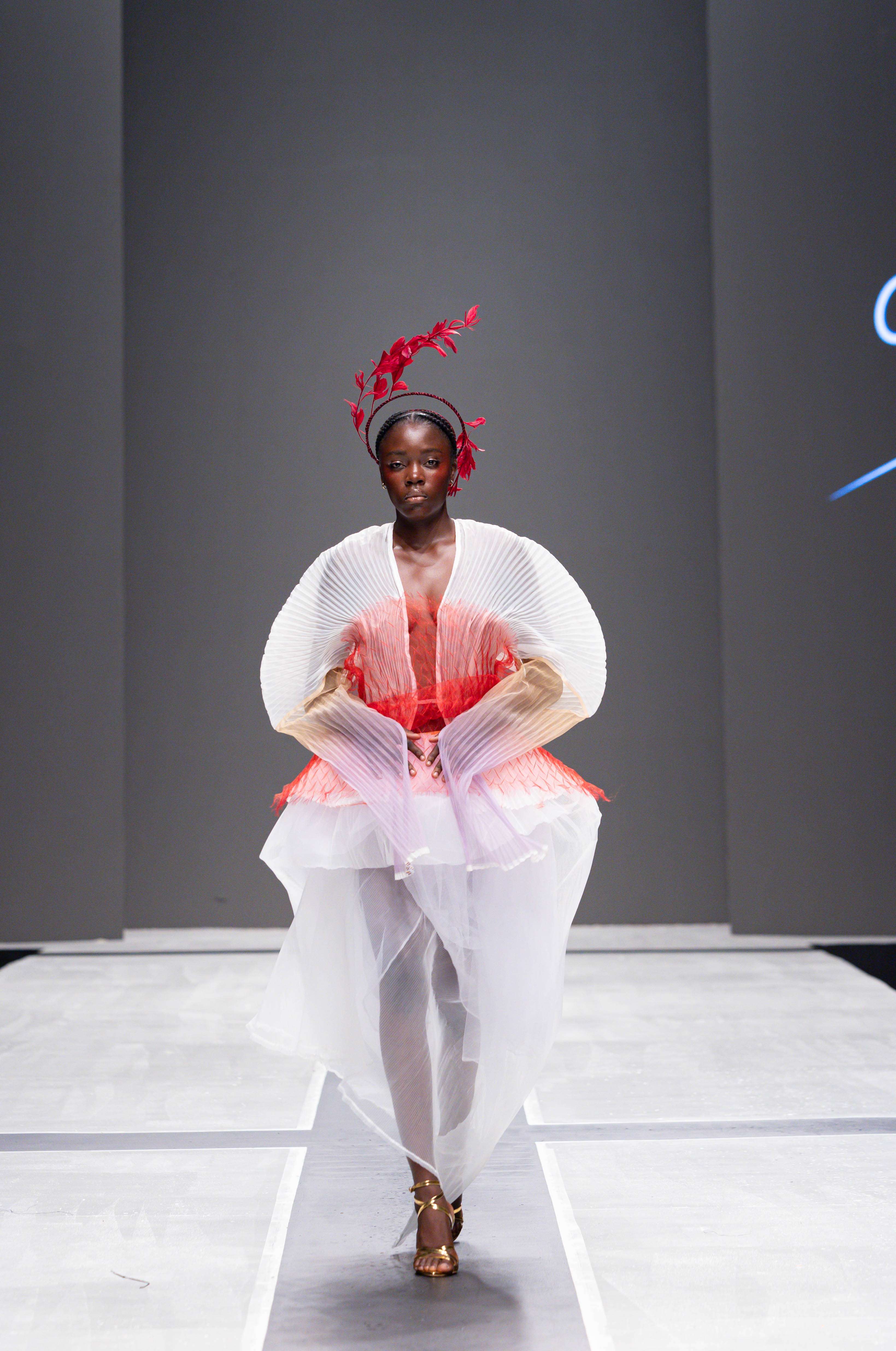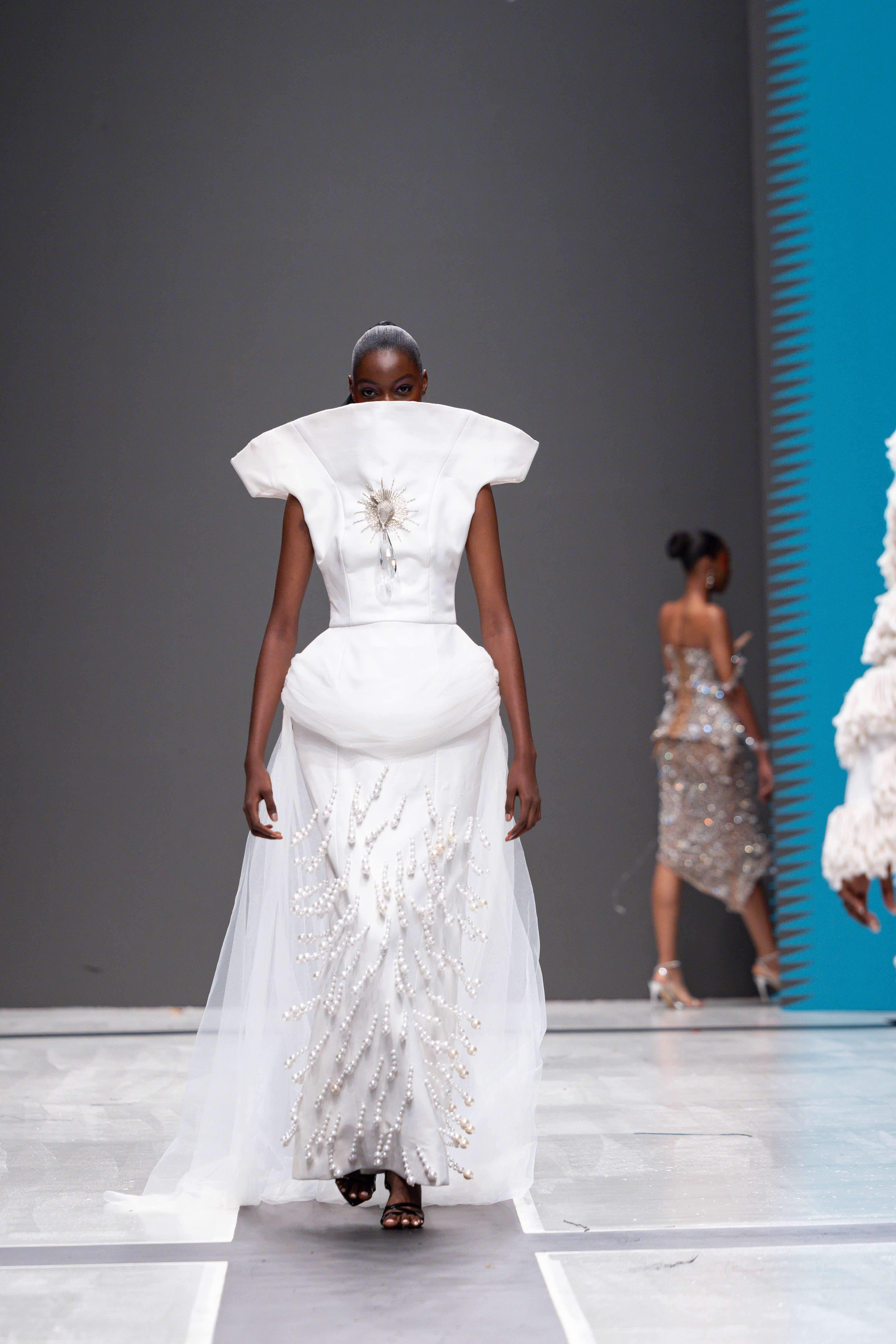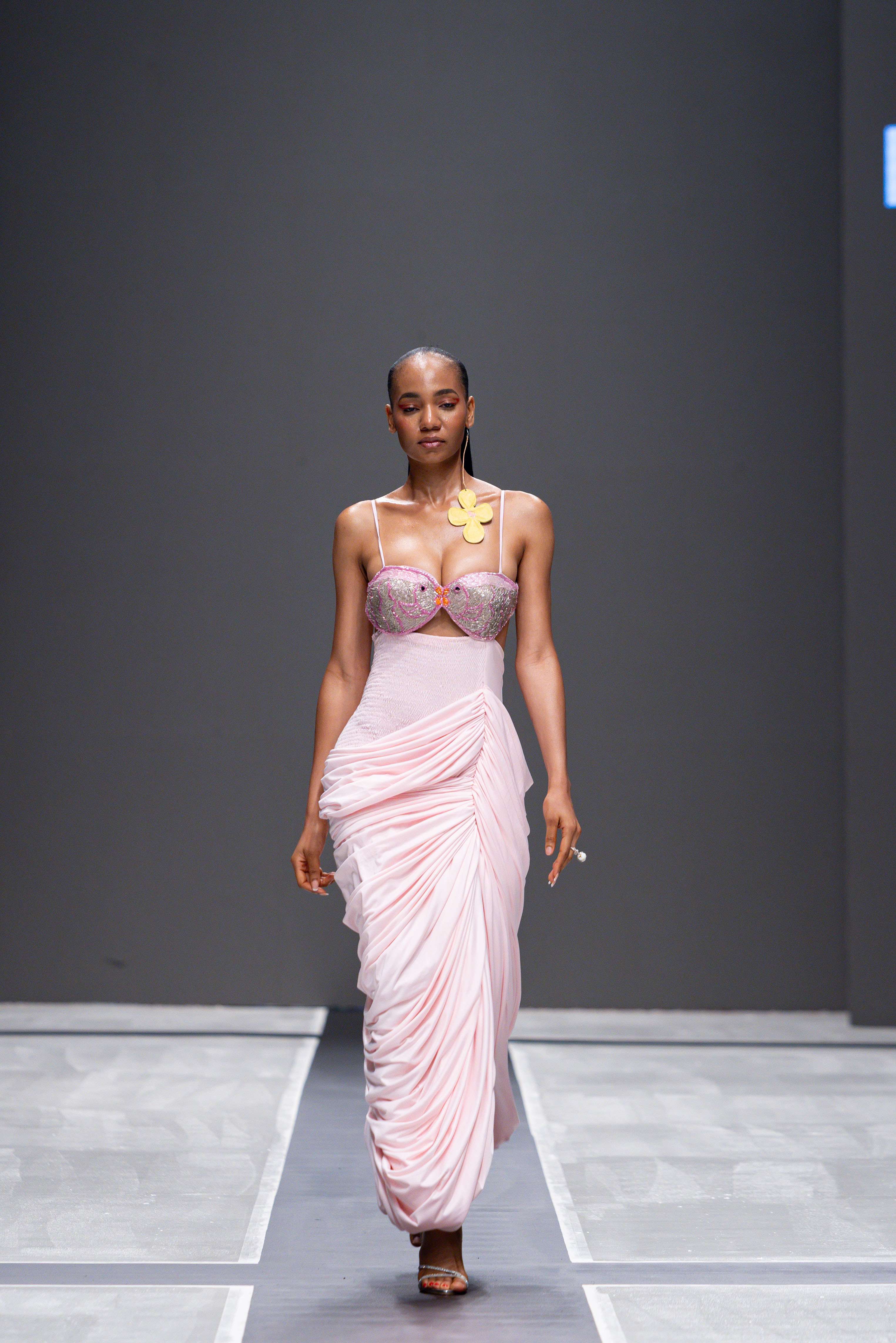 The show opened with Sevon Dejana, whose collection featured bold silhouettes that embodied feminine strength. The couture-inflected designs shimmered with intricate beaded cascades and sculptural lines, capturing the audience’s attention from the first look. Following this, Ibilola Ogundipe offered a softer take on womanhood, presenting flowing fabrics and feather accents that danced gracefully, reminiscent of moving water, while corseted details added a touch of elegance.