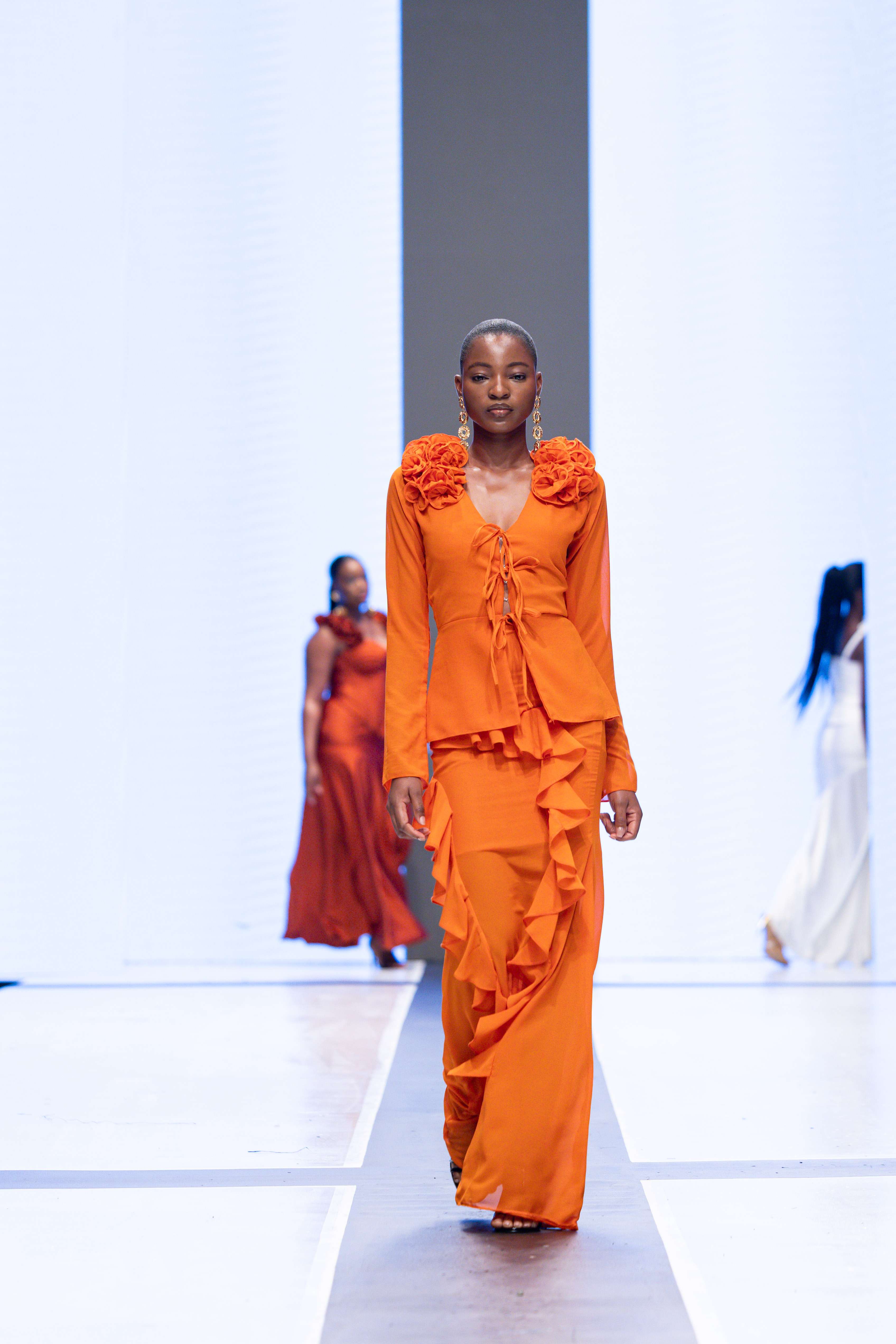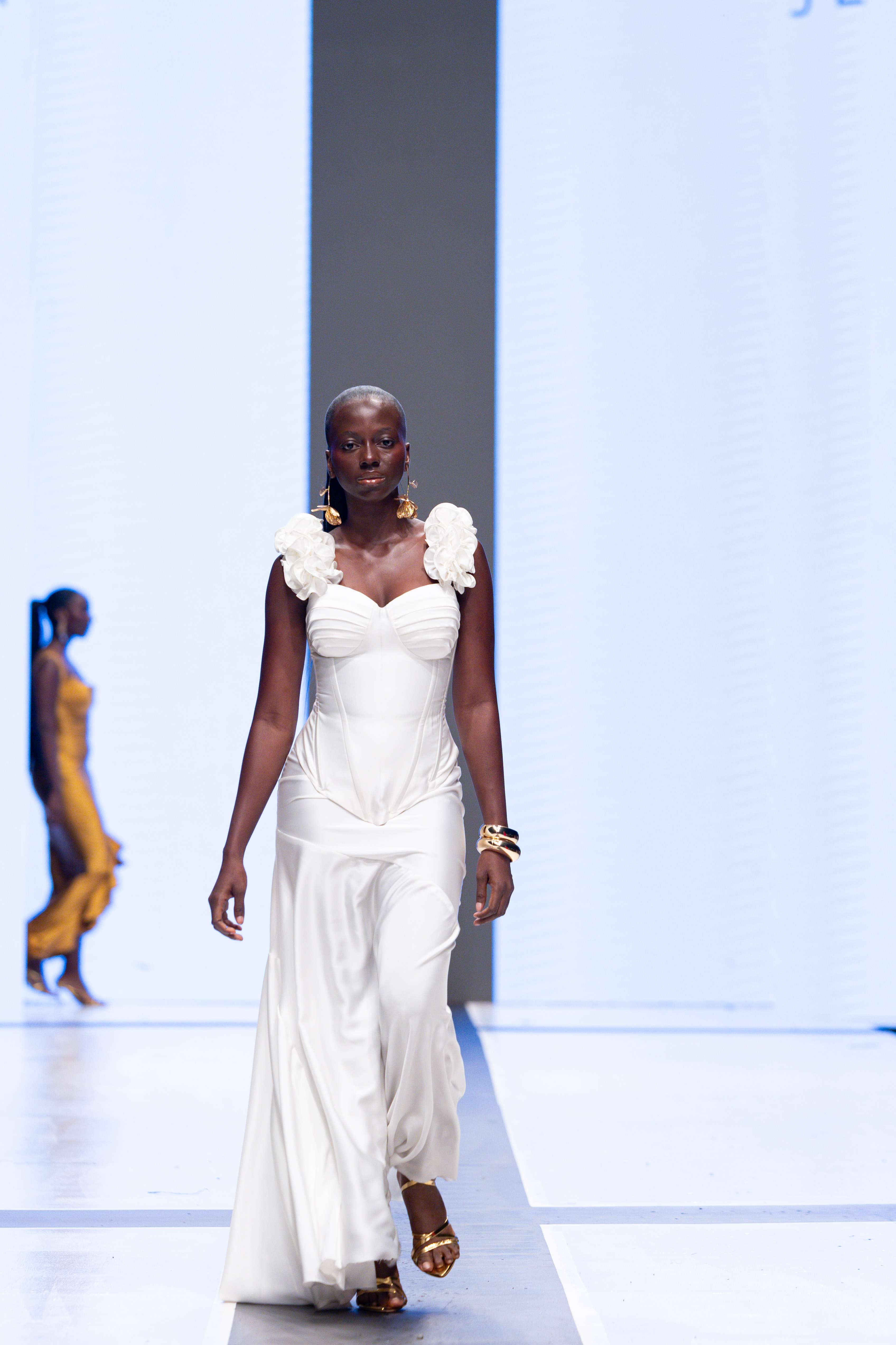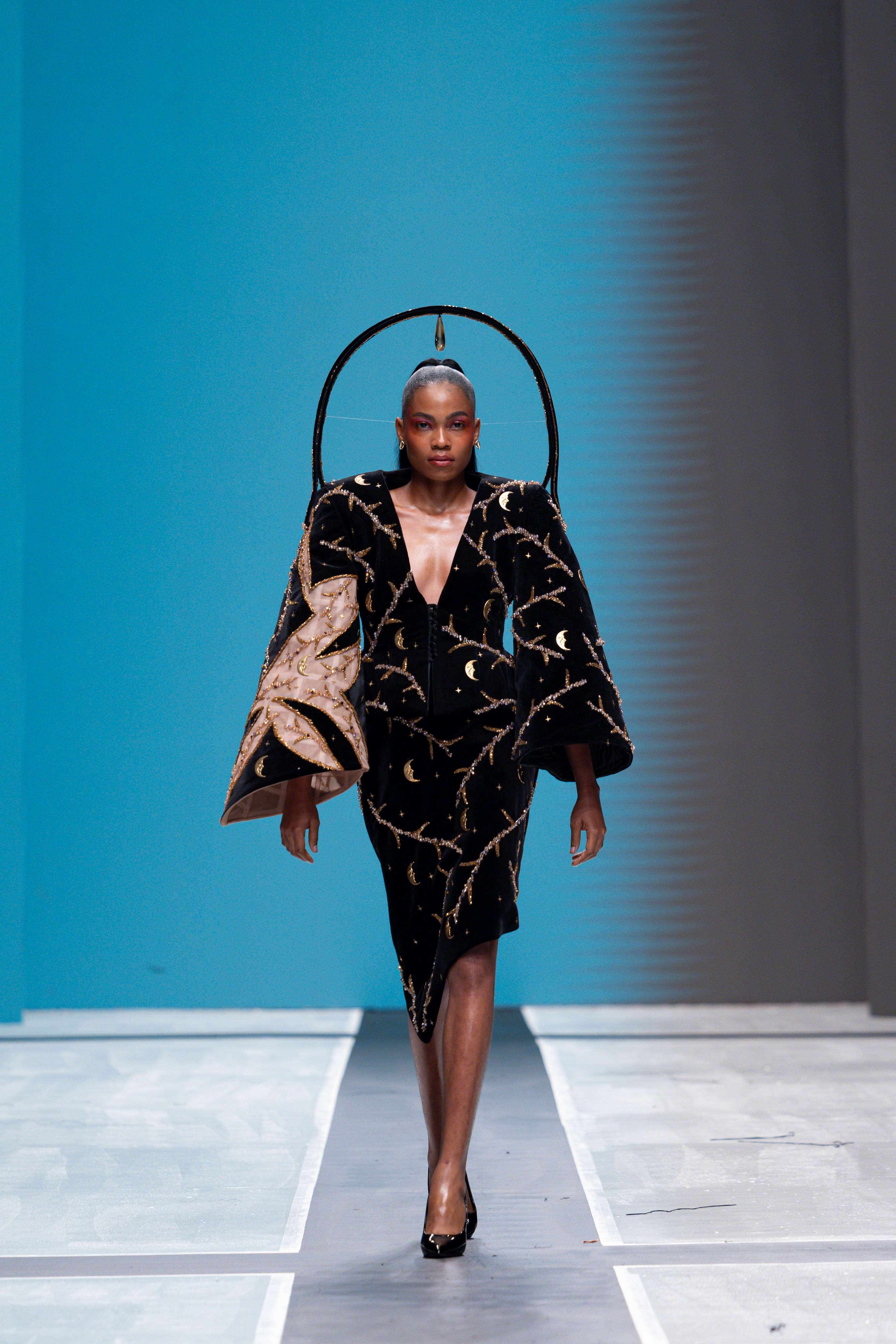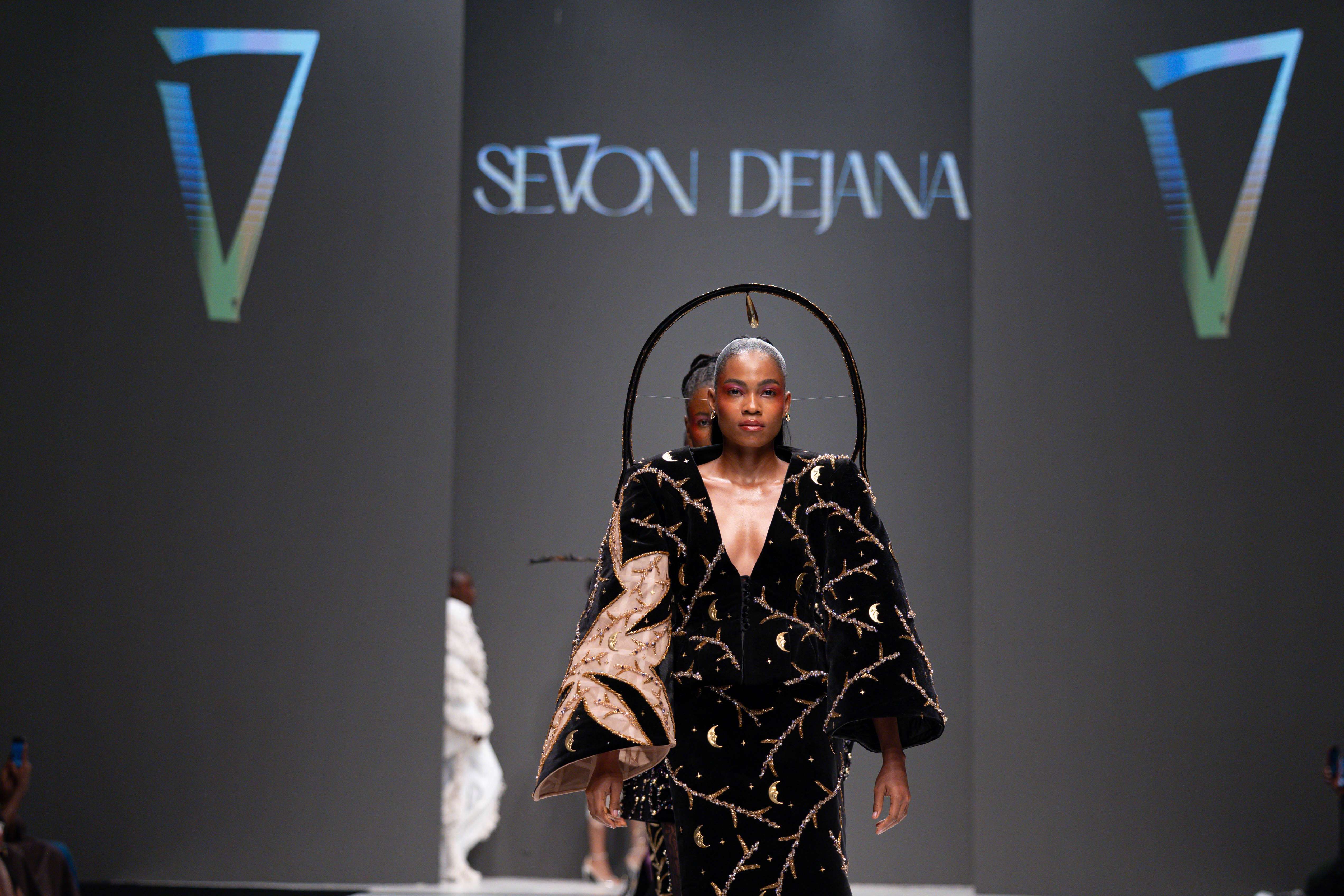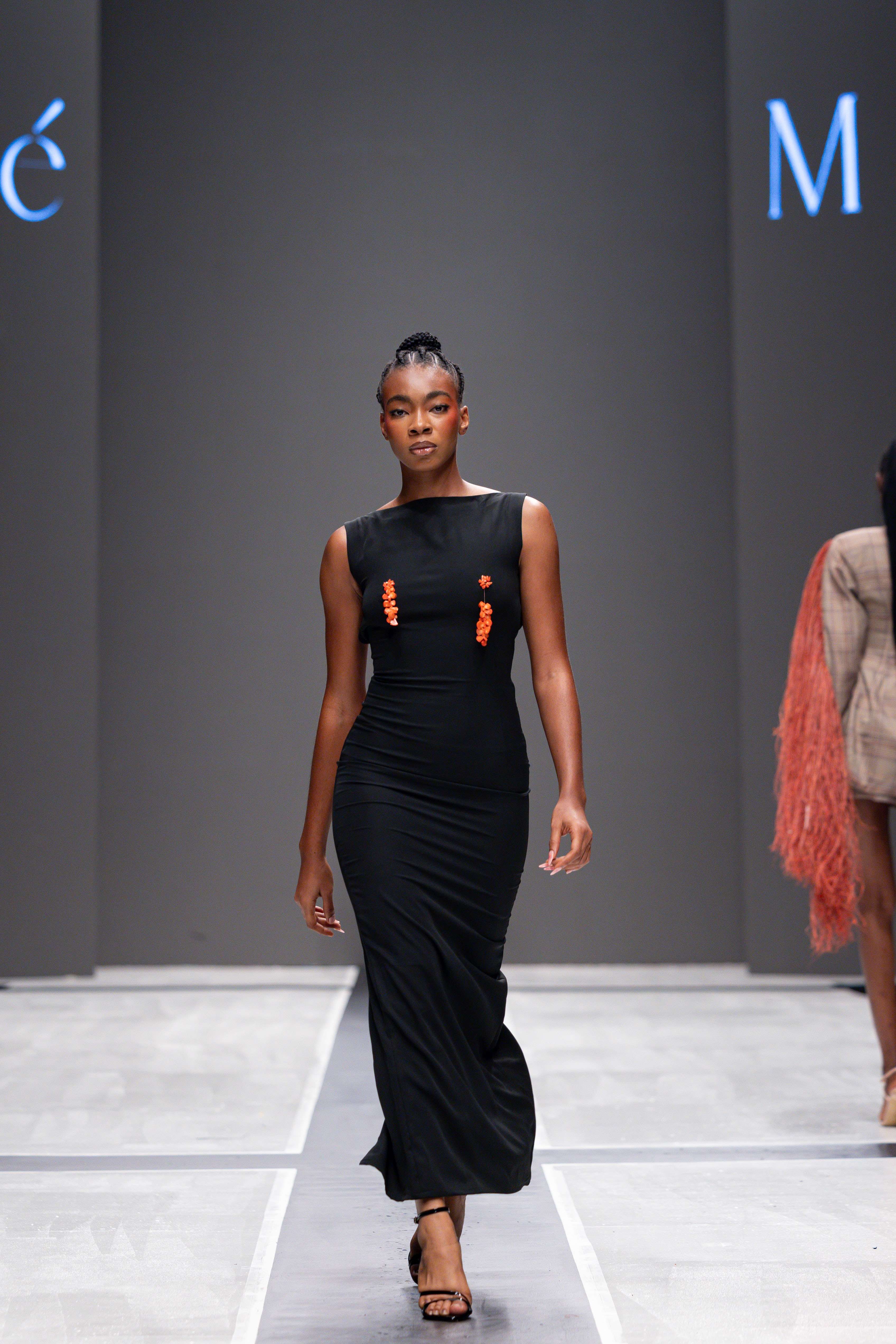 The show opened with Sevon Dejana, whose collection featured bold silhouettes that embodied feminine strength. The couture-inflected designs shimmered with intricate beaded cascades and sculptural lines, capturing the audience’s attention from the first look. Following this, Ibilola Ogundipe offered a softer take on womanhood, presenting flowing fabrics and feather accents that danced gracefully, reminiscent of moving water, while corseted details added a touch of elegance.