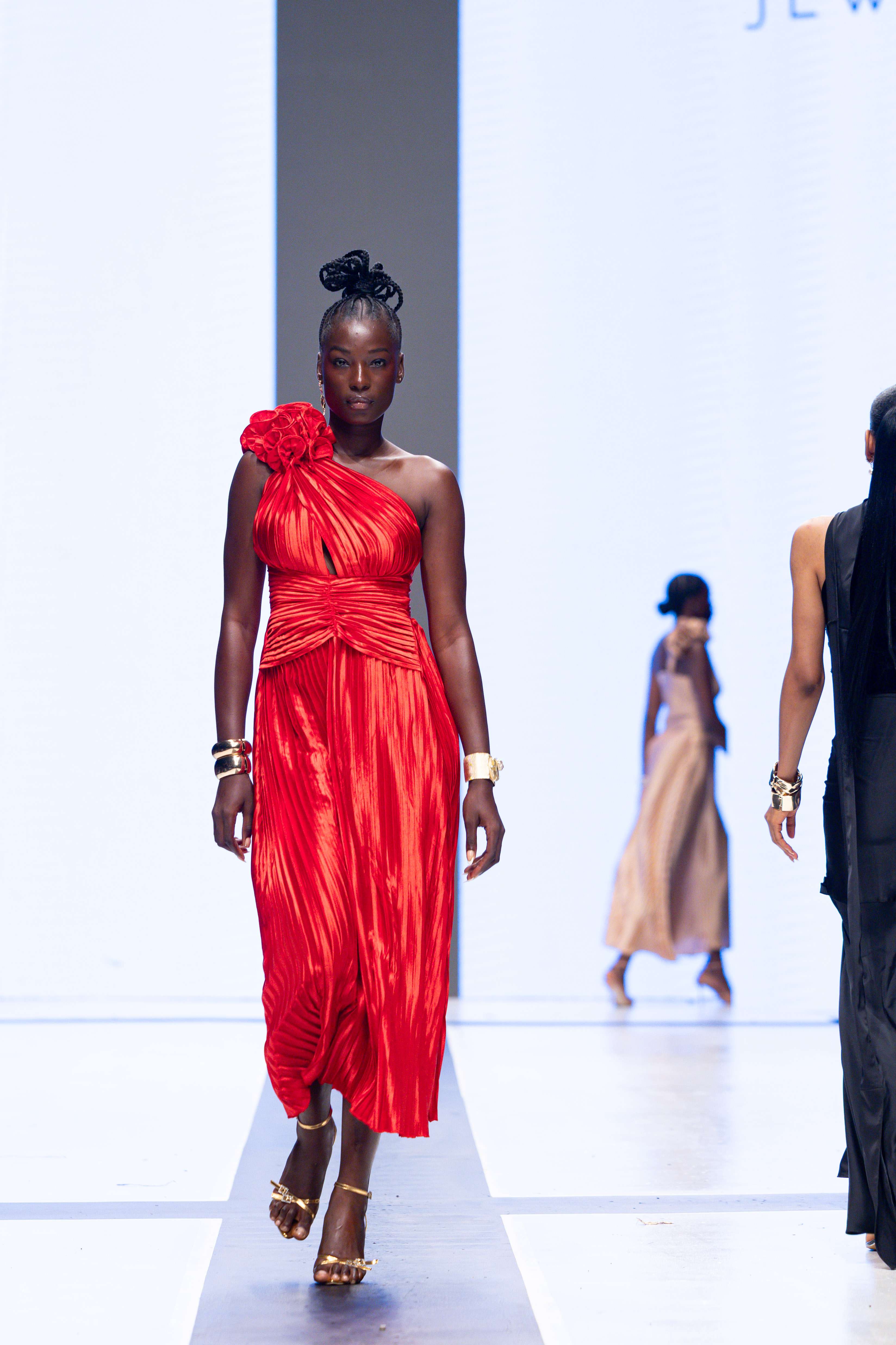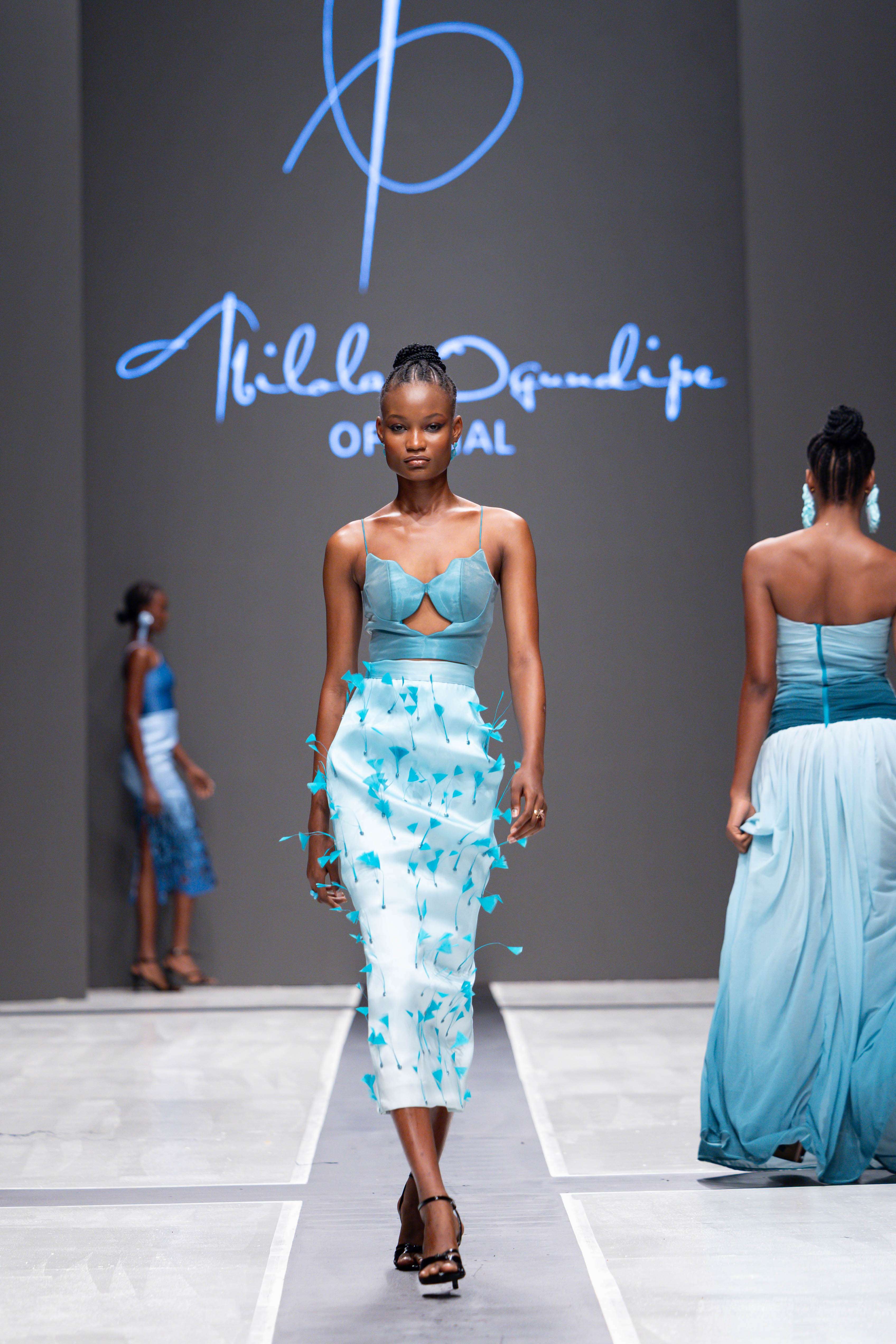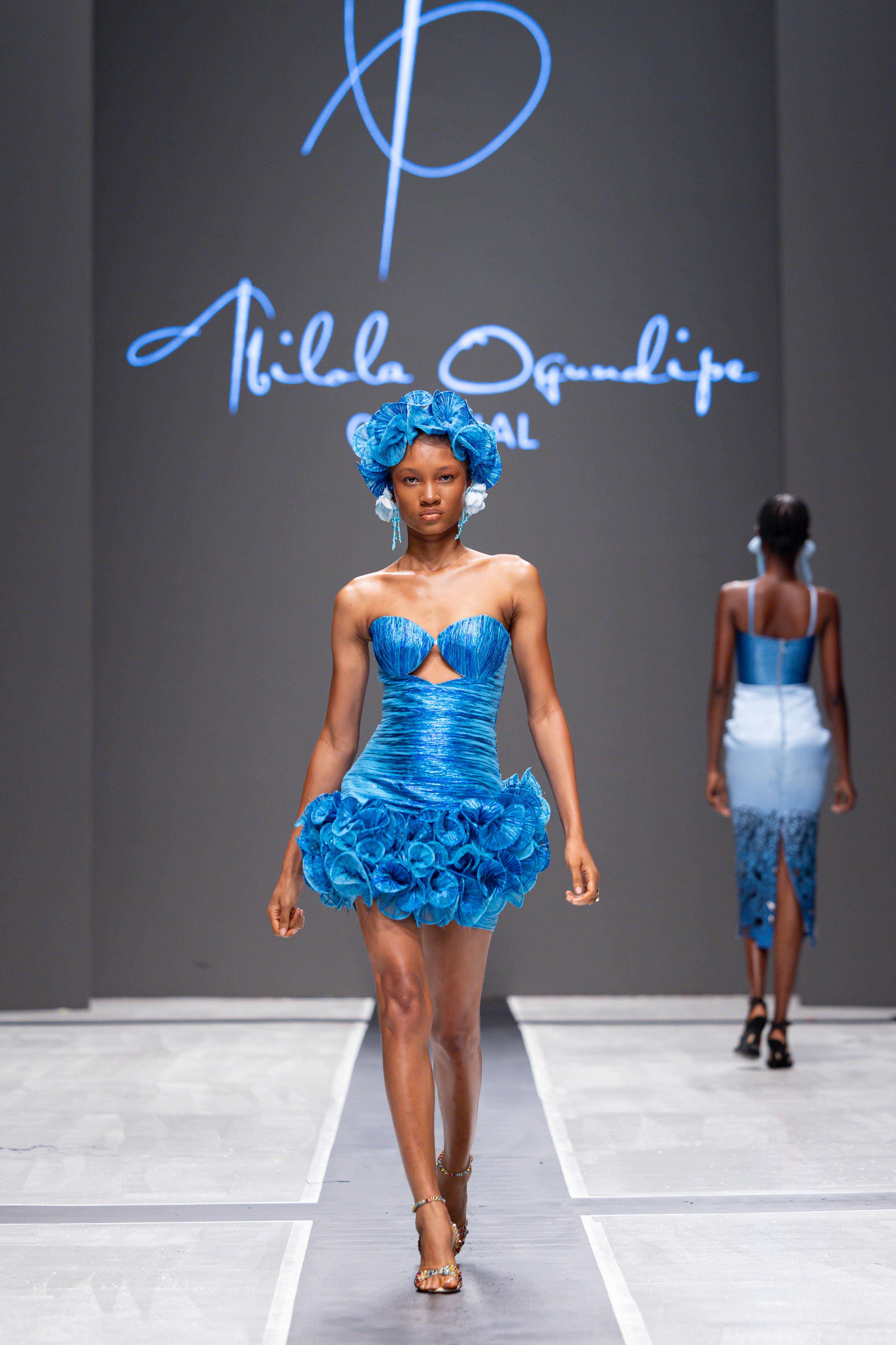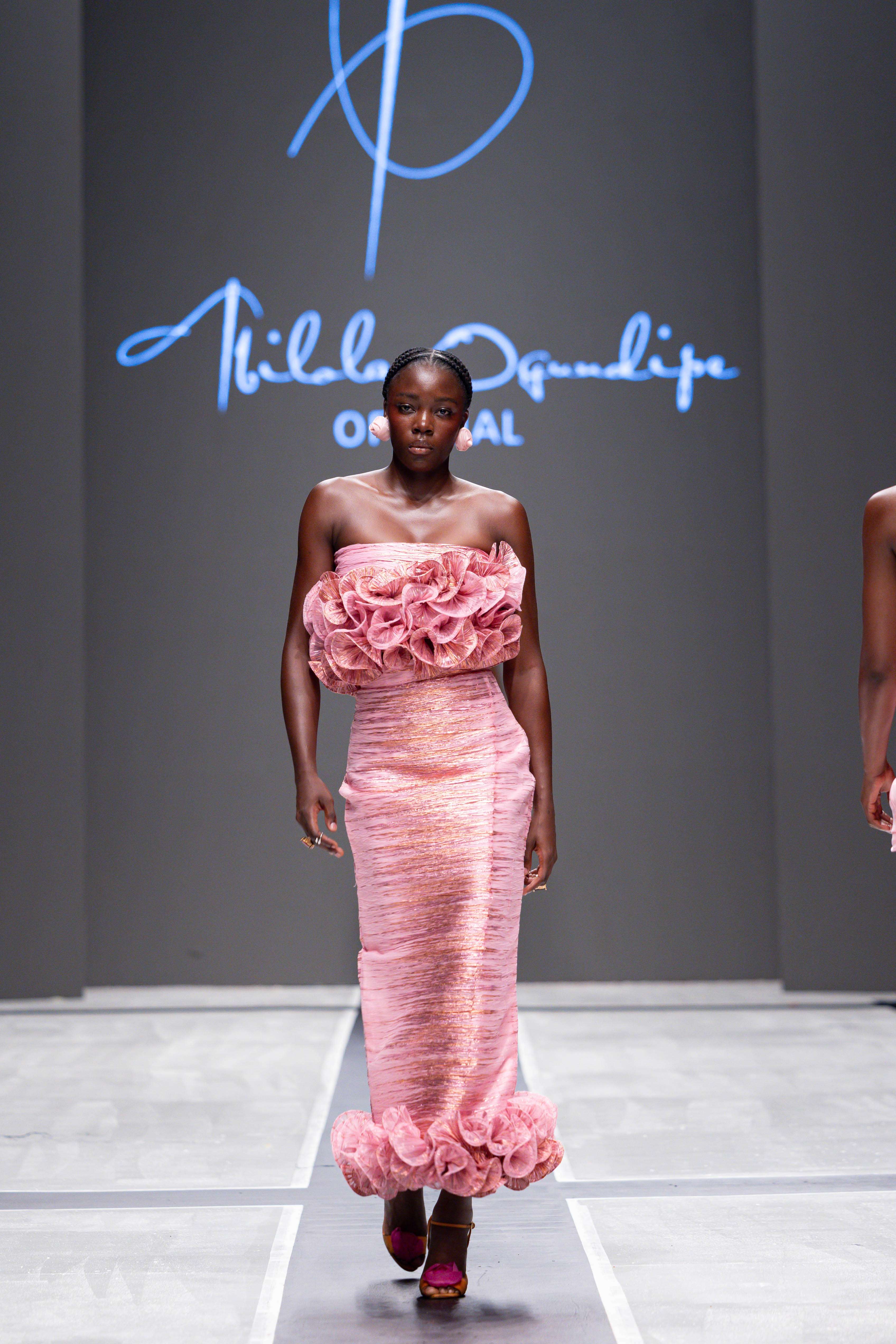 The show opened with Sevon Dejana, whose collection featured bold silhouettes that embodied feminine strength. The couture-inflected designs shimmered with intricate beaded cascades and sculptural lines, capturing the audience’s attention from the first look. Following this, Ibilola Ogundipe offered a softer take on womanhood, presenting flowing fabrics and feather accents that danced gracefully, reminiscent of moving water, while corseted details added a touch of elegance.