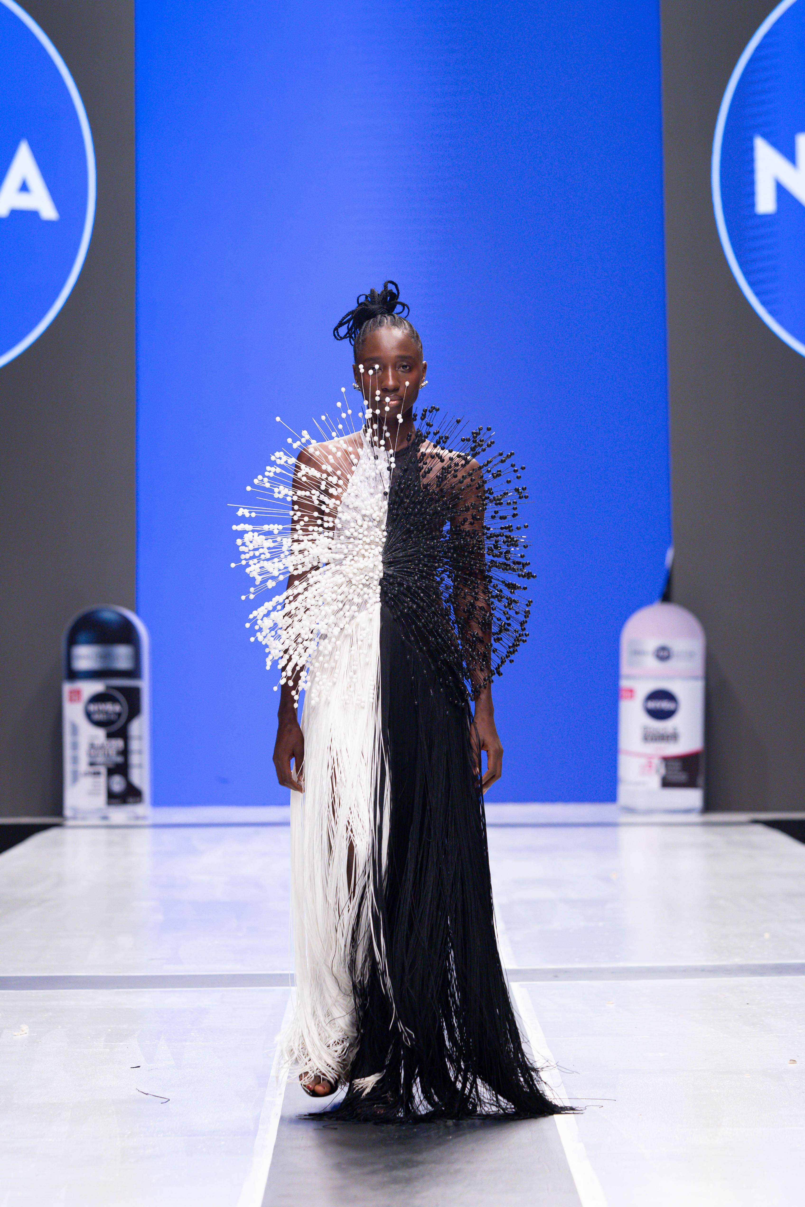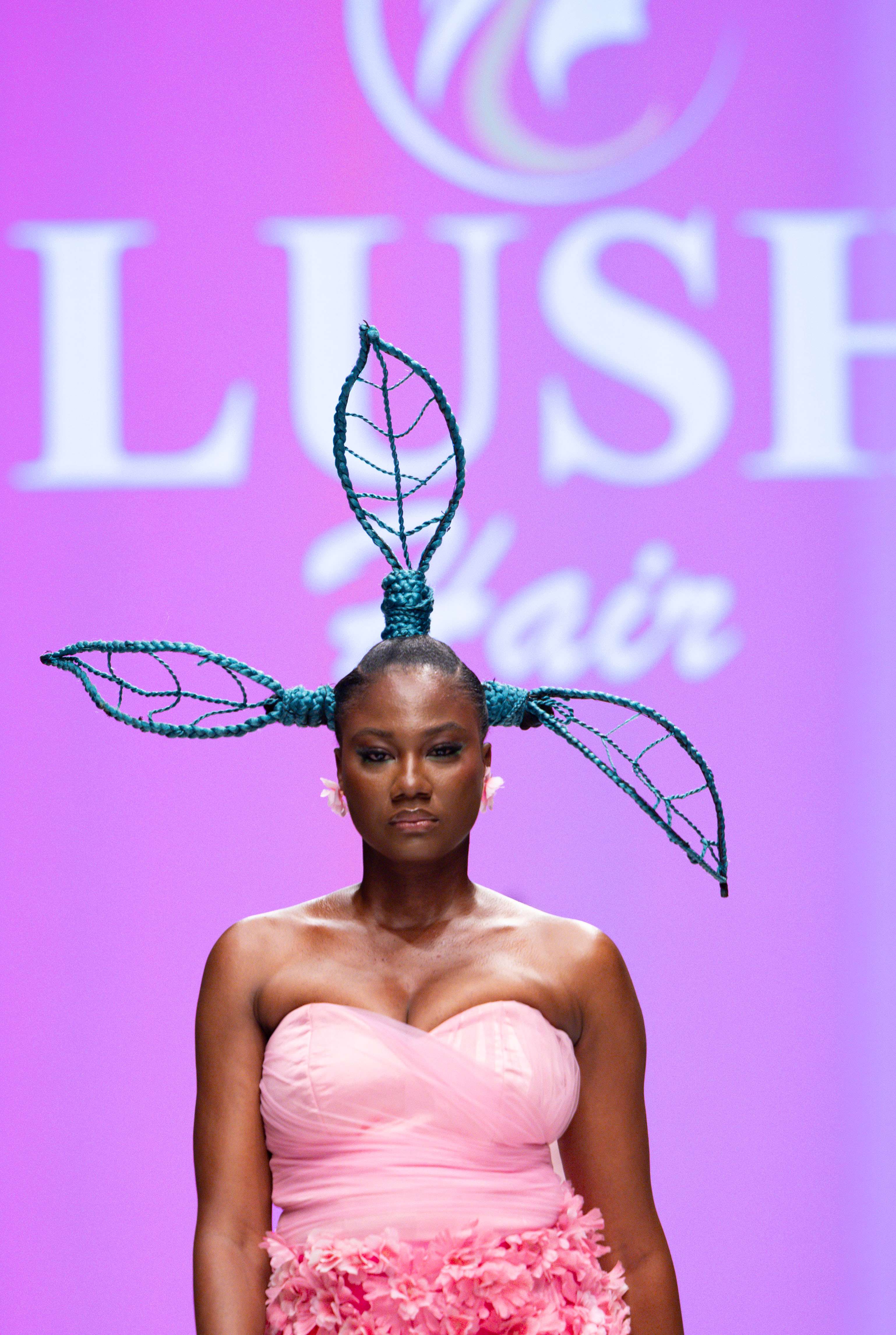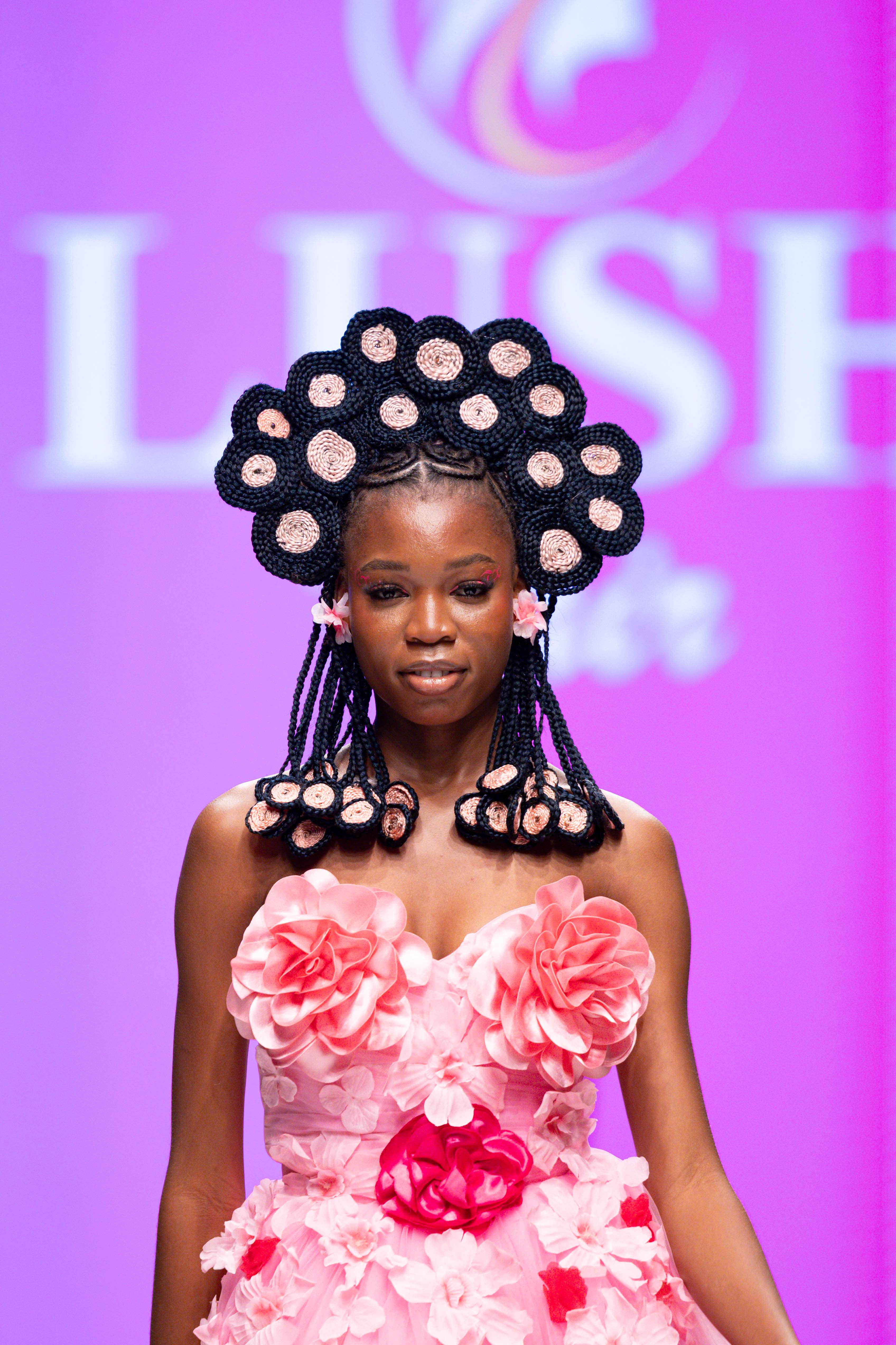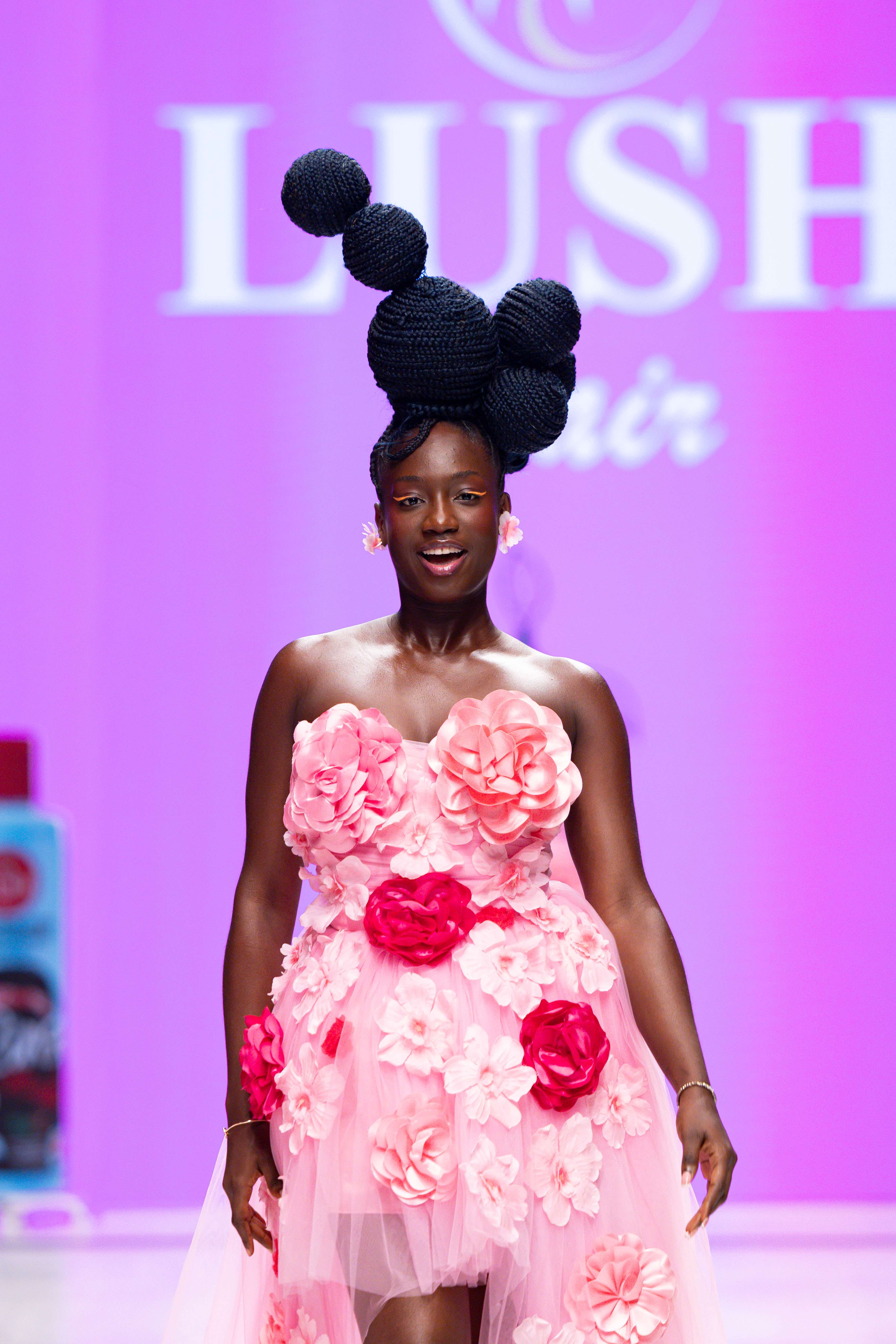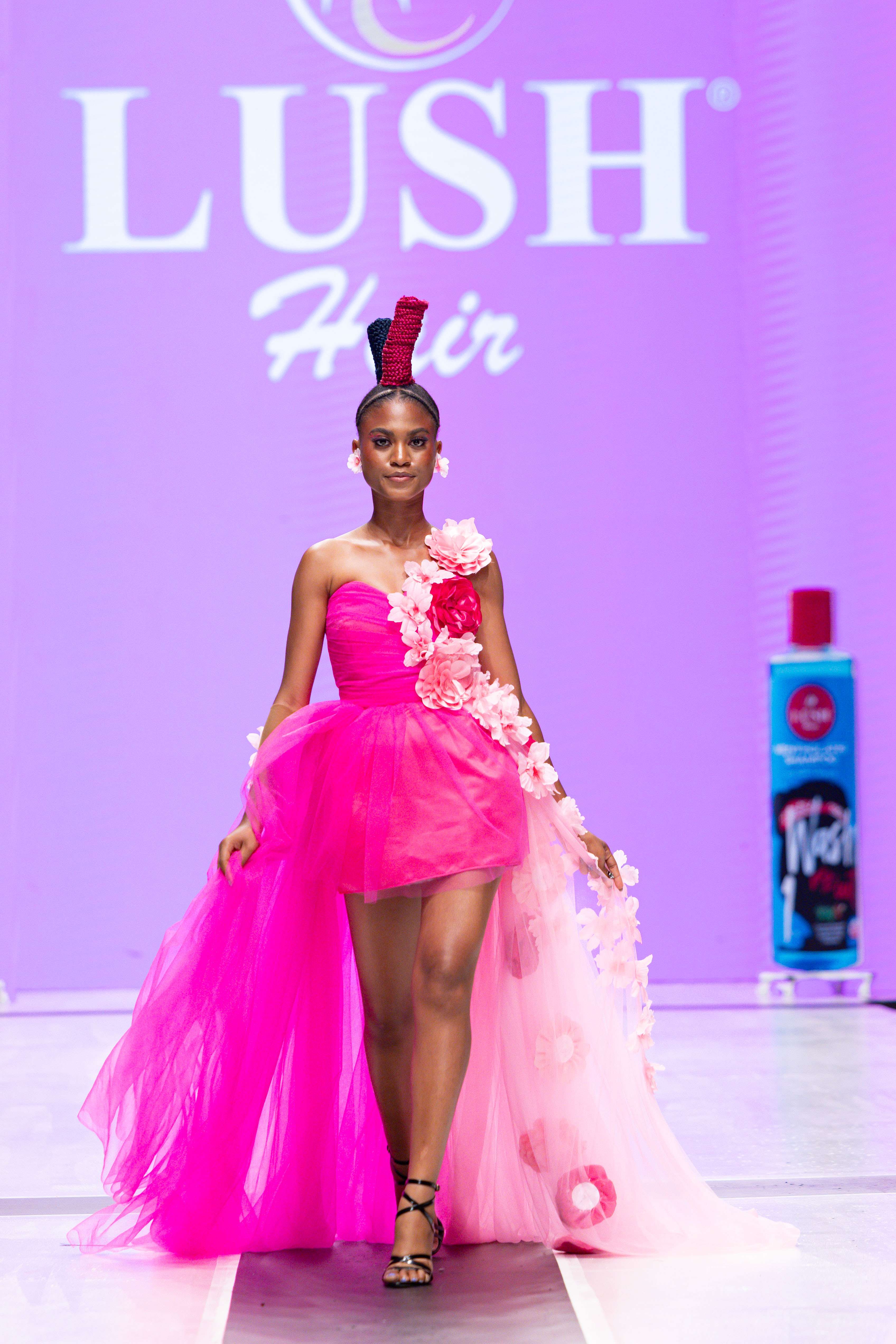 Collaborative presentations added an exciting dimension to the evening. The NIVEA x Fruché partnership unveiled a monochrome capsule collection, featuring sheer suiting and textured fringe that captivated the audience. Lush Hair transformed the runway into a visual spectacle, highlighting texture and volume, with the grand finale featuring chef Hilda Baci in a stunning flowing pink dress and sculptural afrocentric hairstyle.