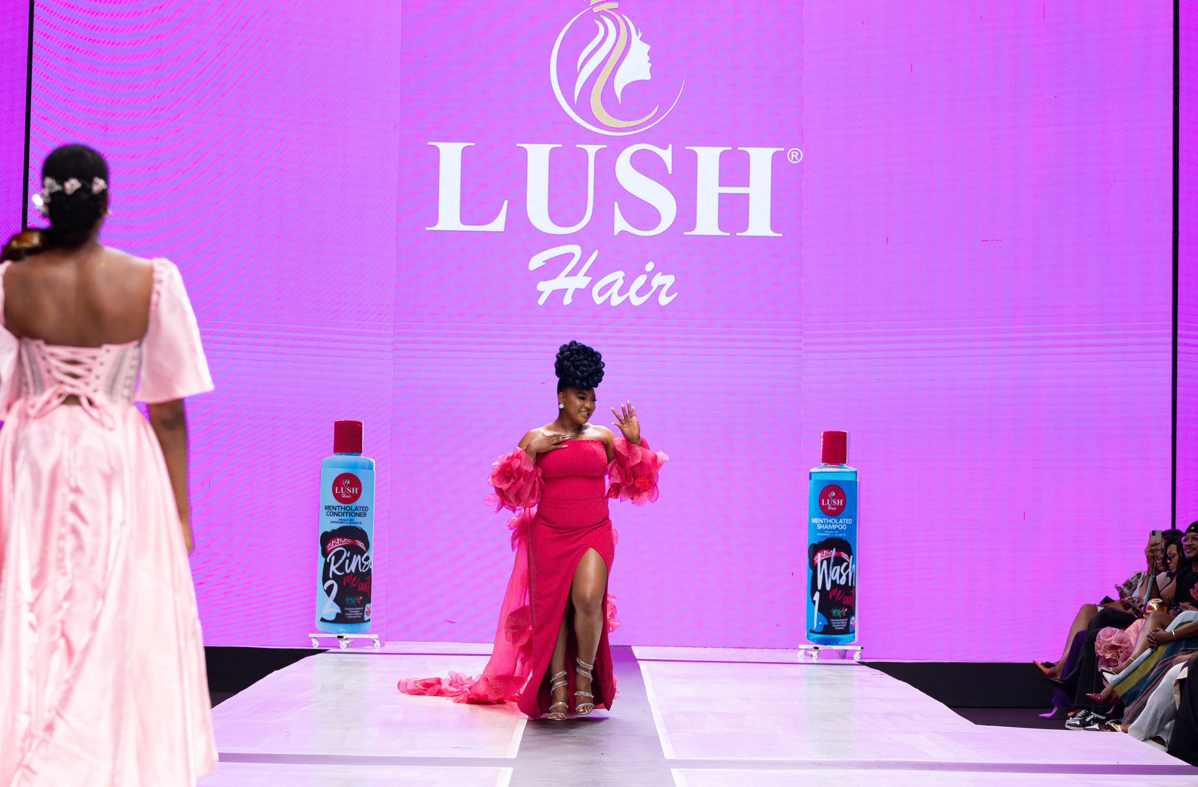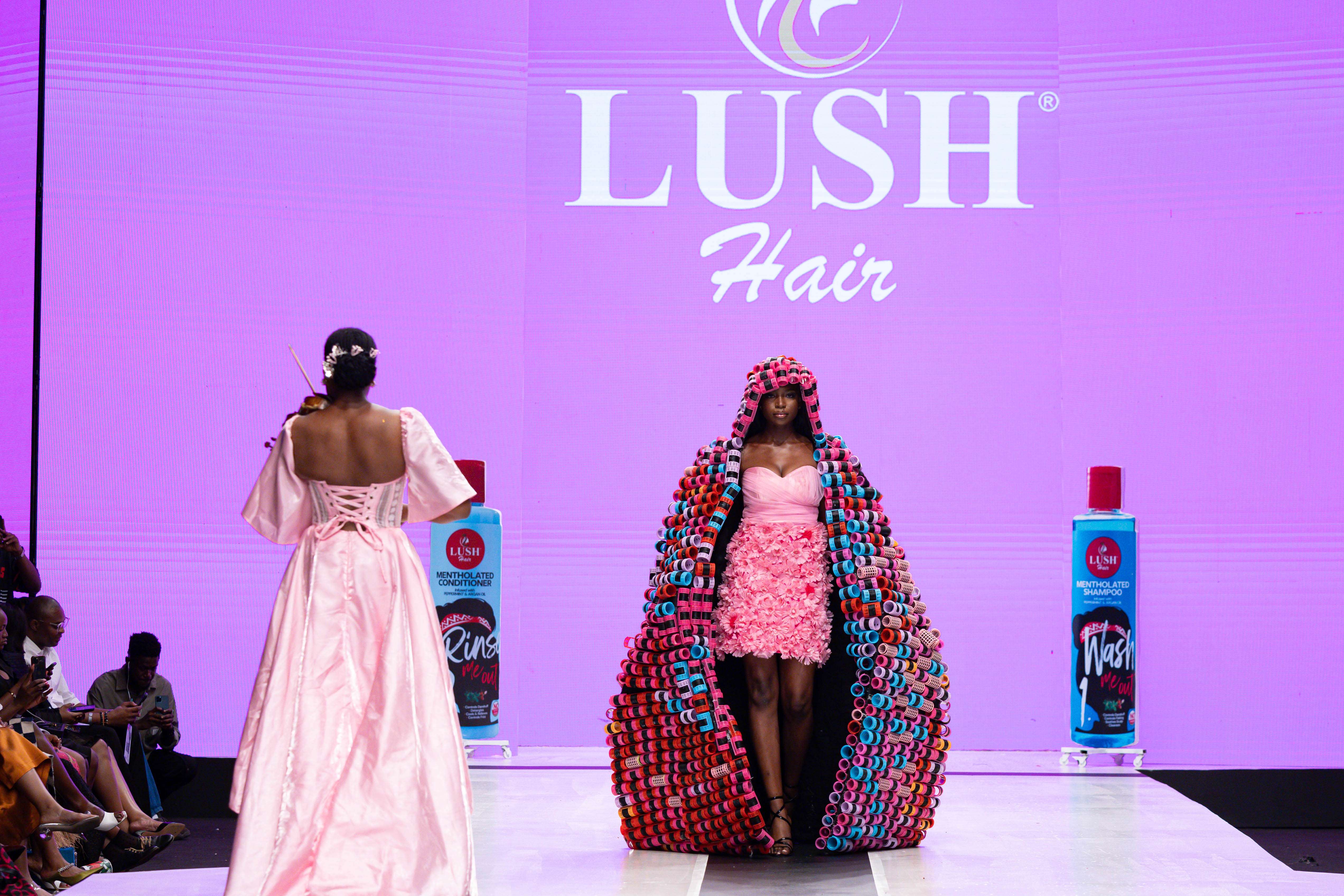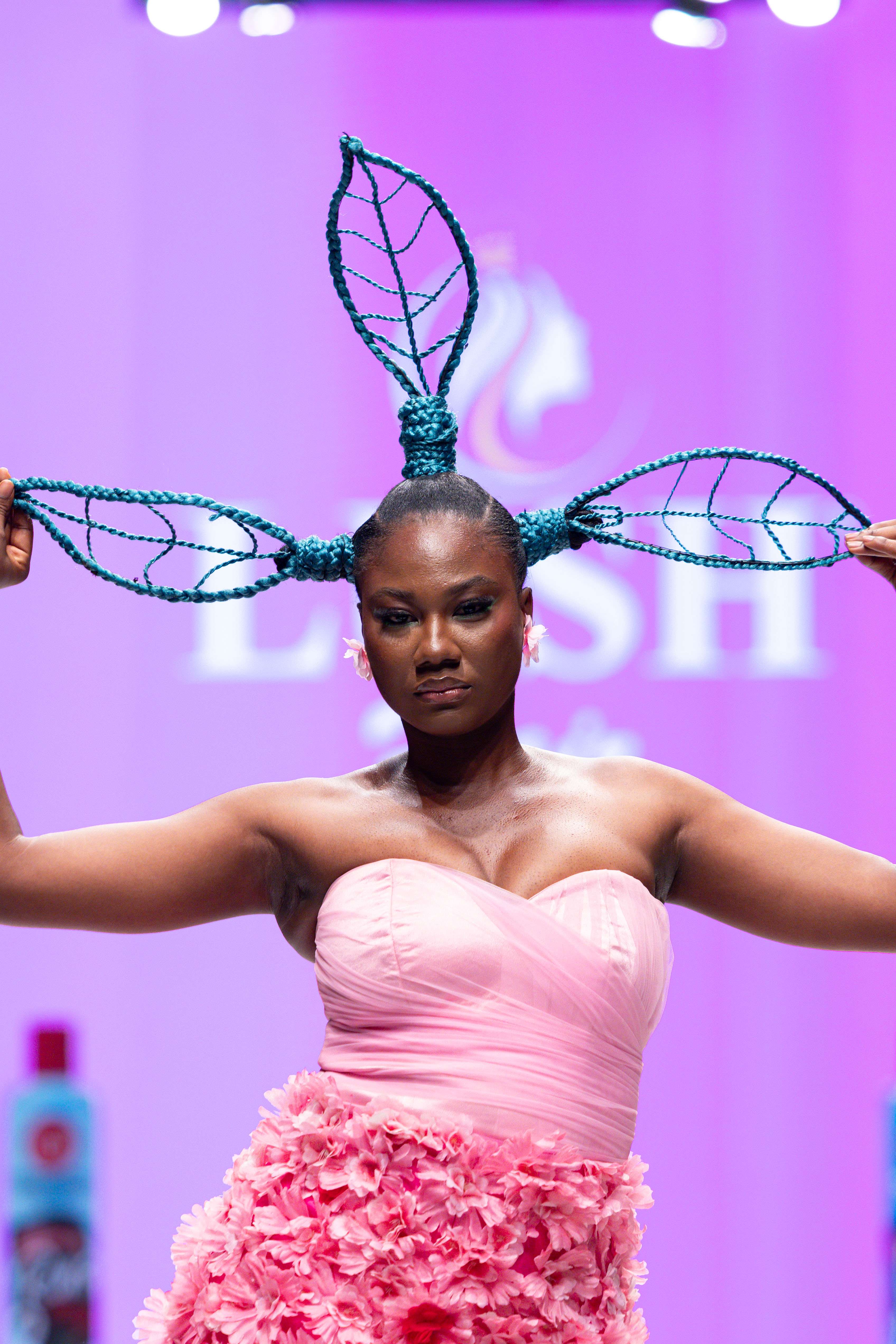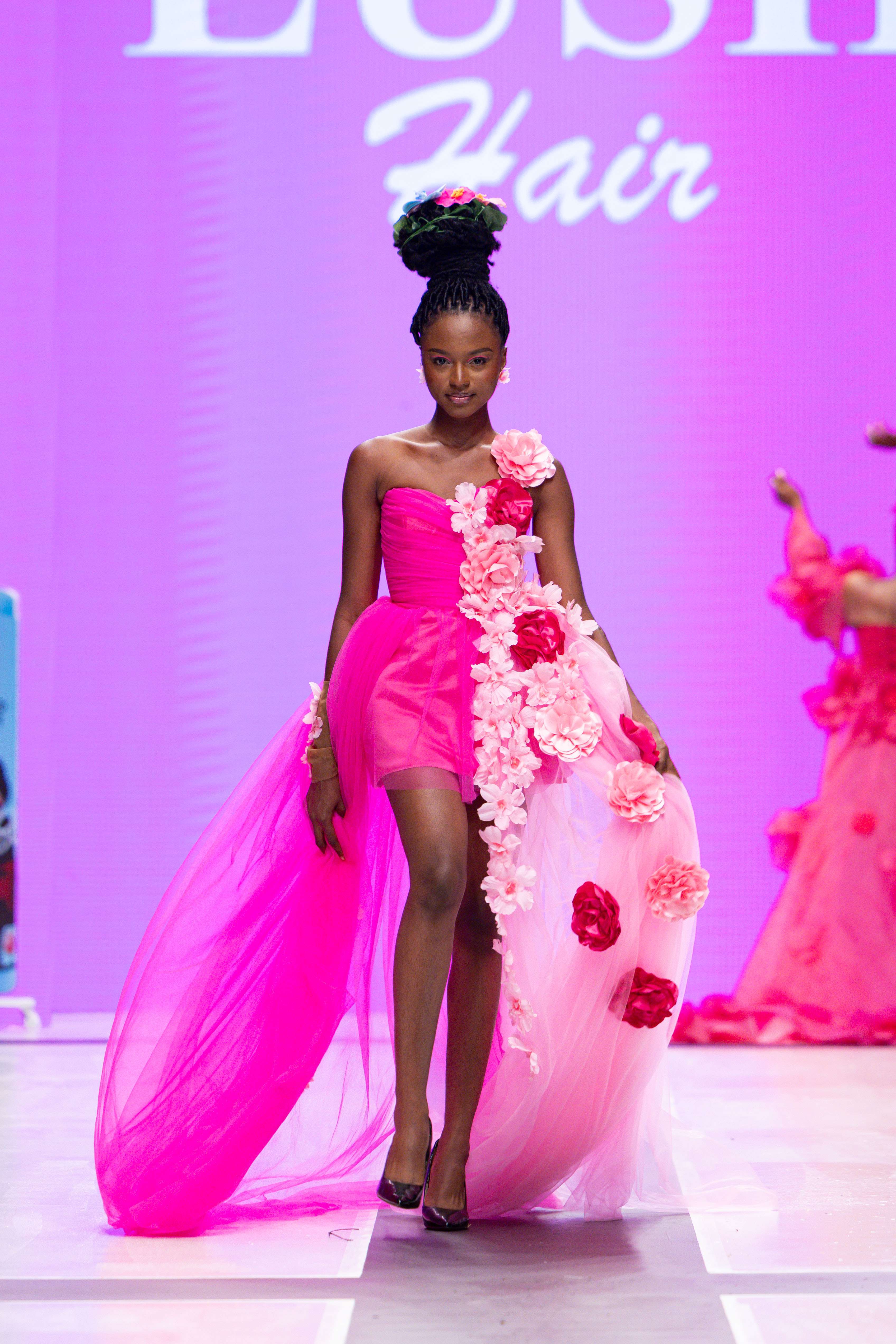 Collaborative presentations added an exciting dimension to the evening. The NIVEA x Fruché partnership unveiled a monochrome capsule collection, featuring sheer suiting and textured fringe that captivated the audience. Lush Hair transformed the runway into a visual spectacle, highlighting texture and volume, with the grand finale featuring chef Hilda Baci in a stunning flowing pink dress and sculptural afrocentric hairstyle.
