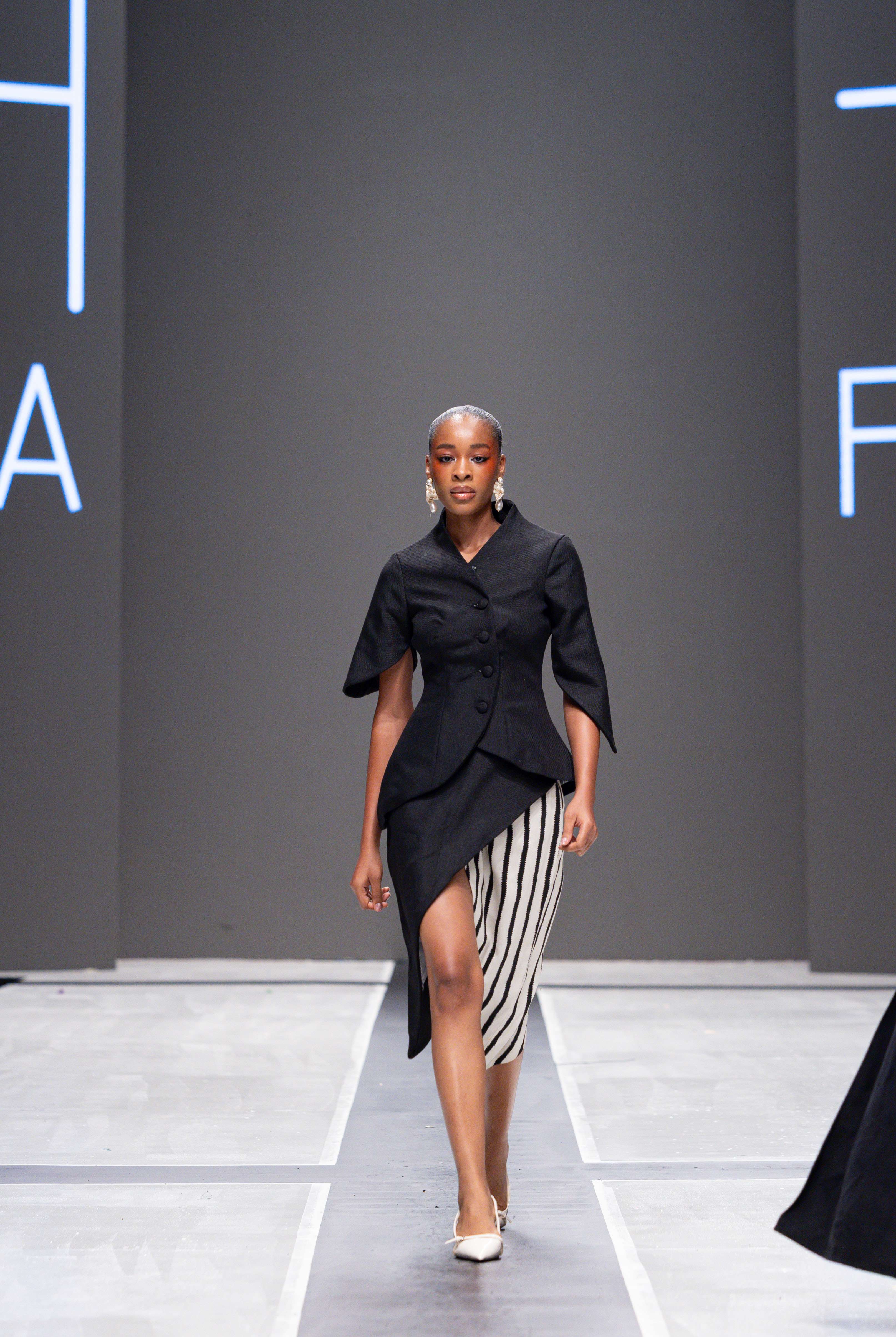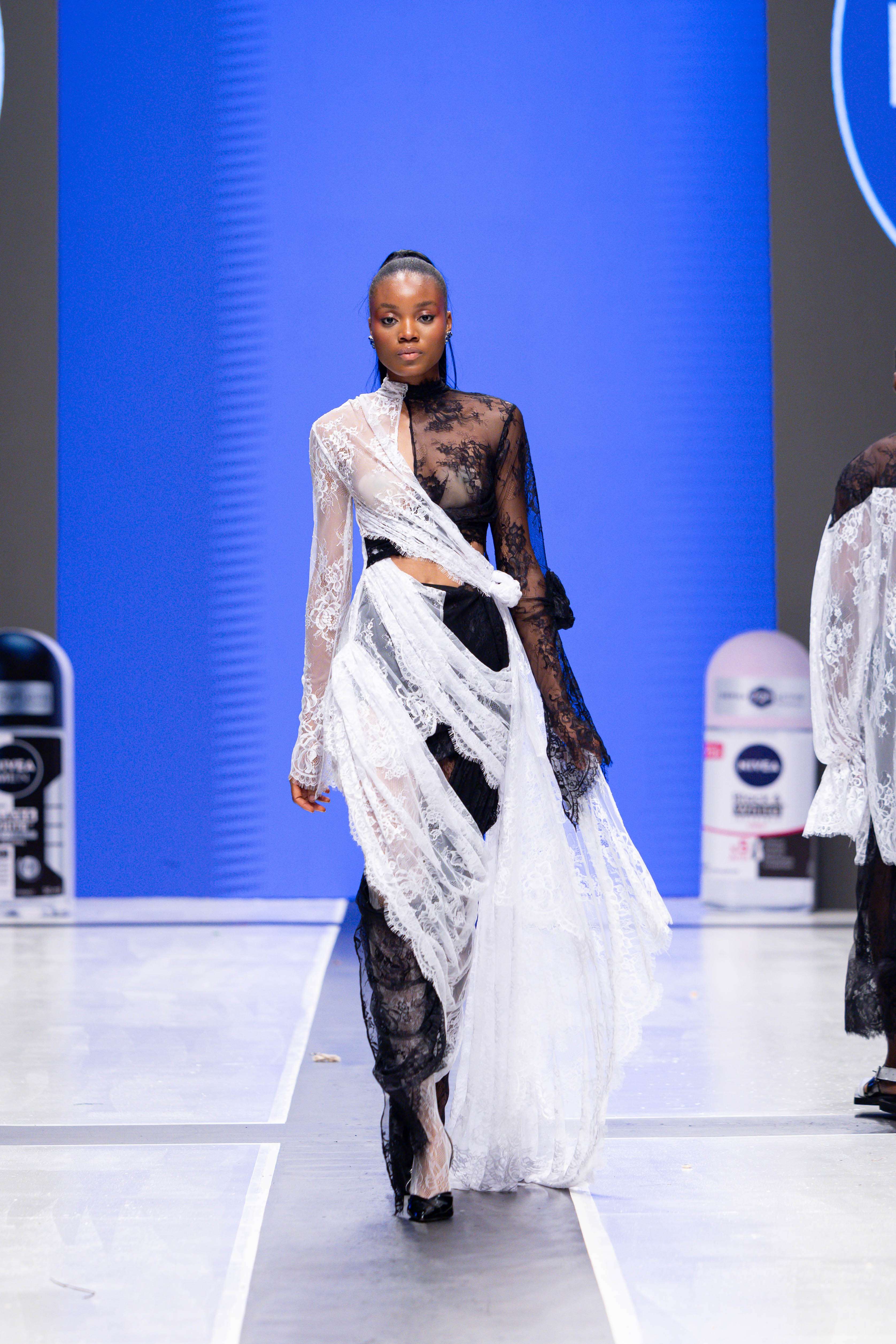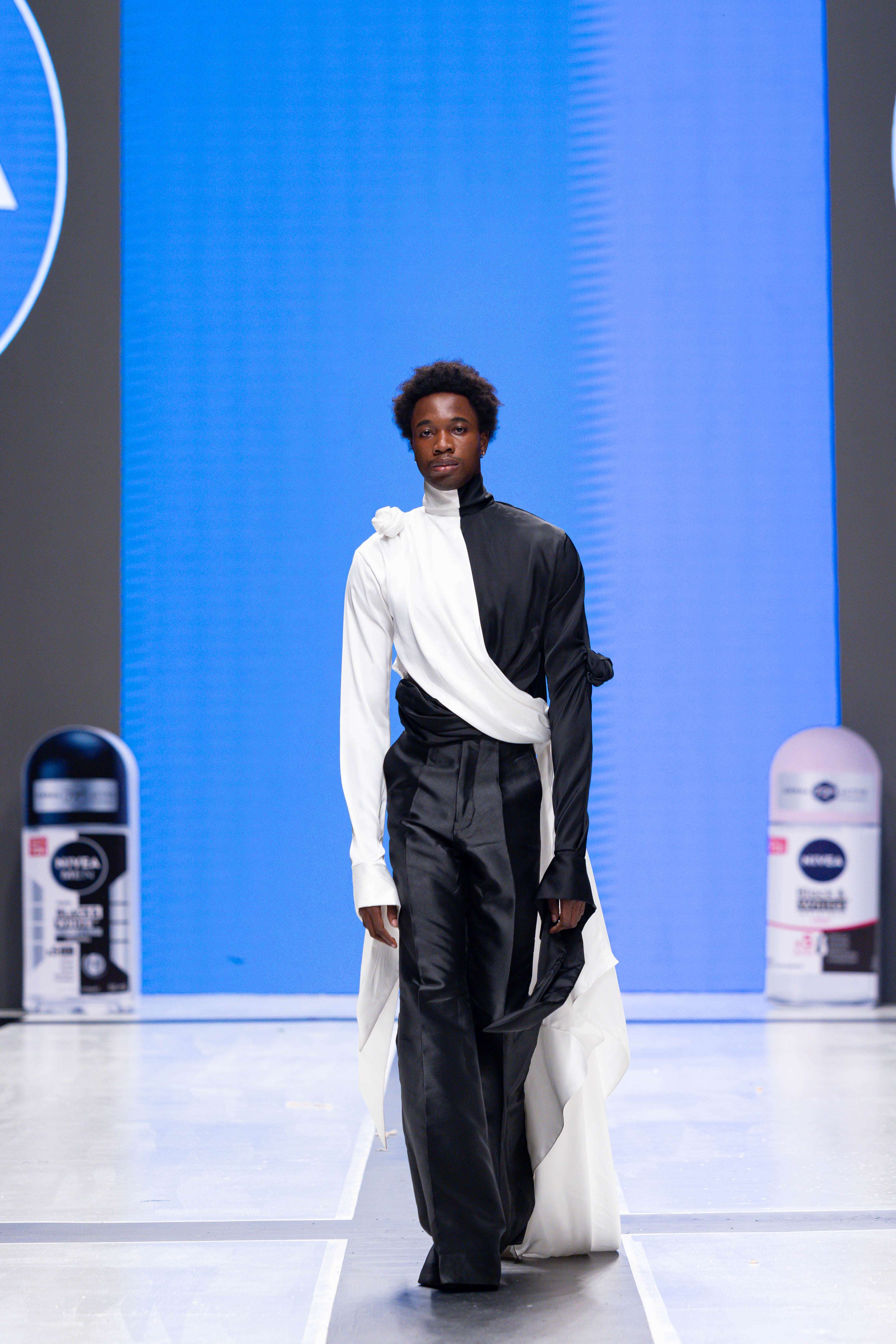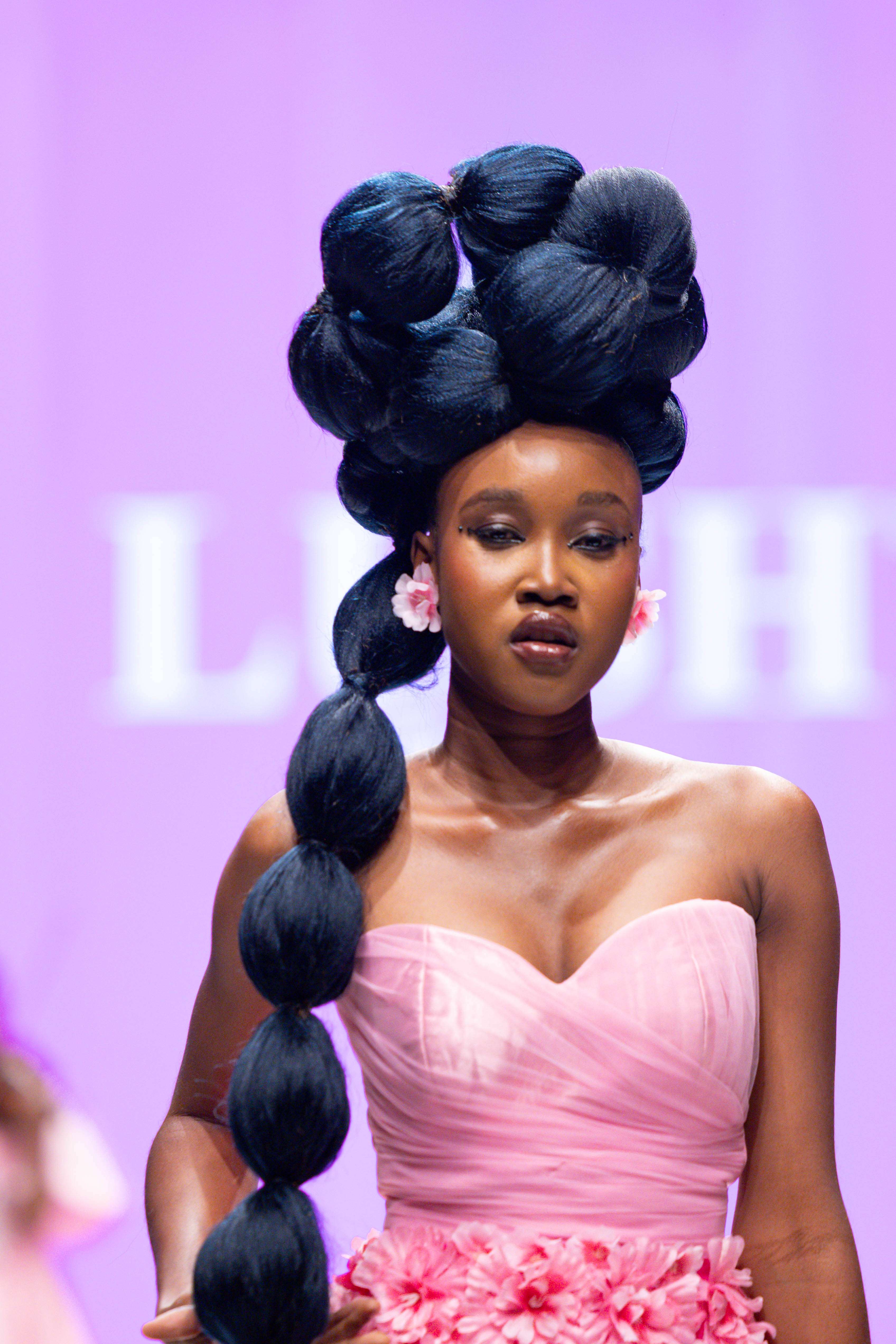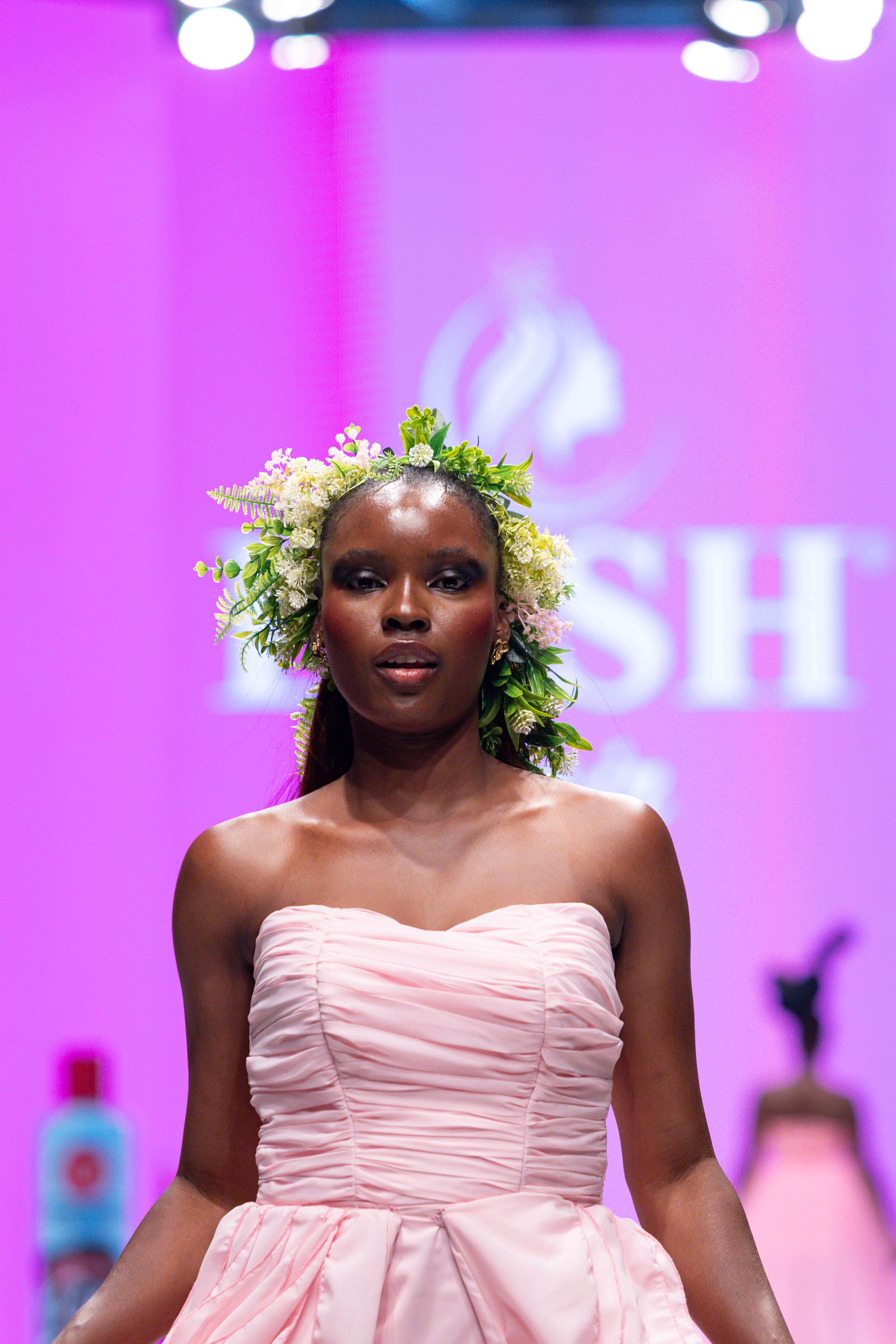 Collaborative presentations added an exciting dimension to the evening. The NIVEA x Fruché partnership unveiled a monochrome capsule collection, featuring sheer suiting and textured fringe that captivated the audience. Lush Hair transformed the runway into a visual spectacle, highlighting texture and volume, with the grand finale featuring chef Hilda Baci in a stunning flowing pink dress and sculptural afrocentric hairstyle.