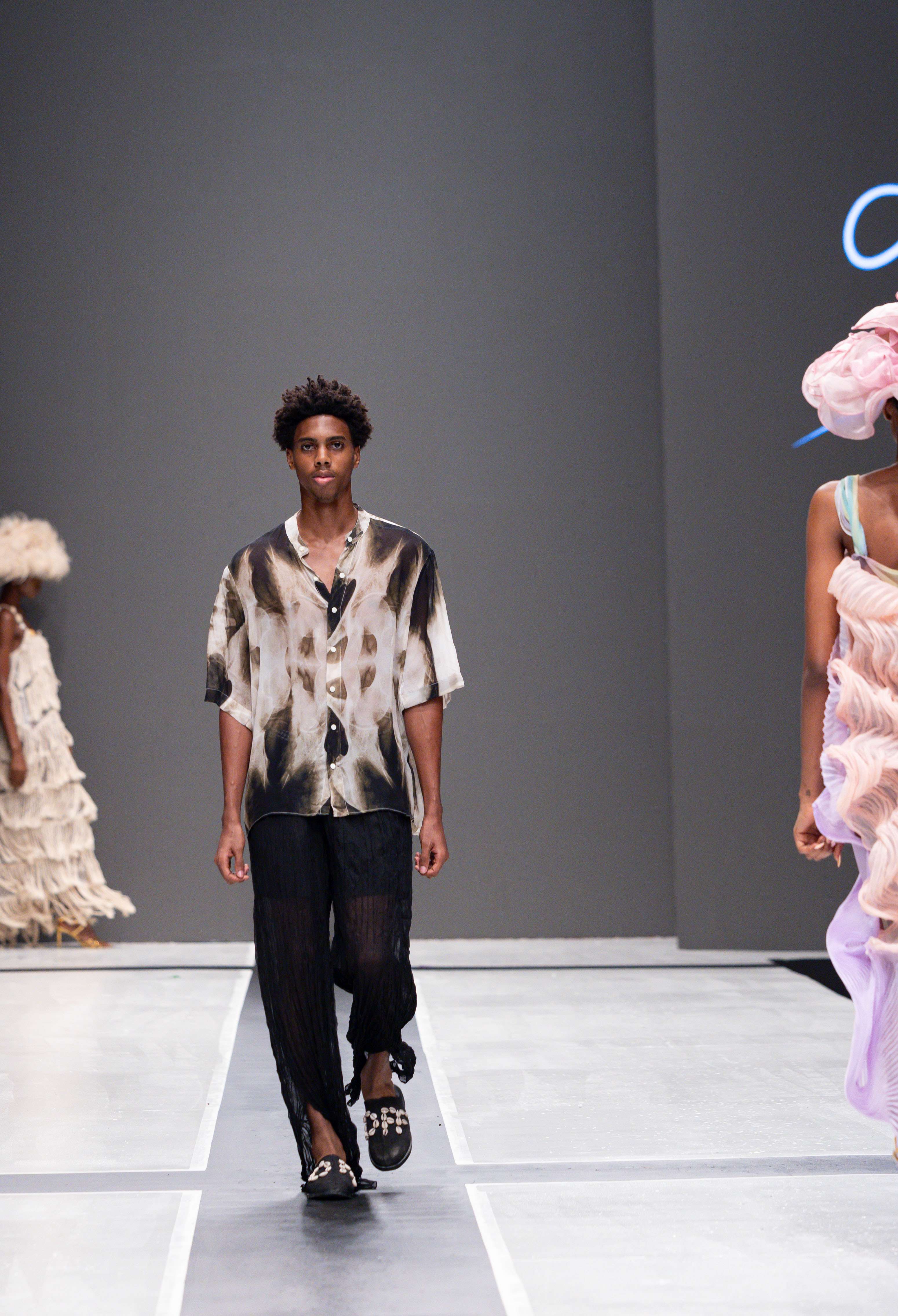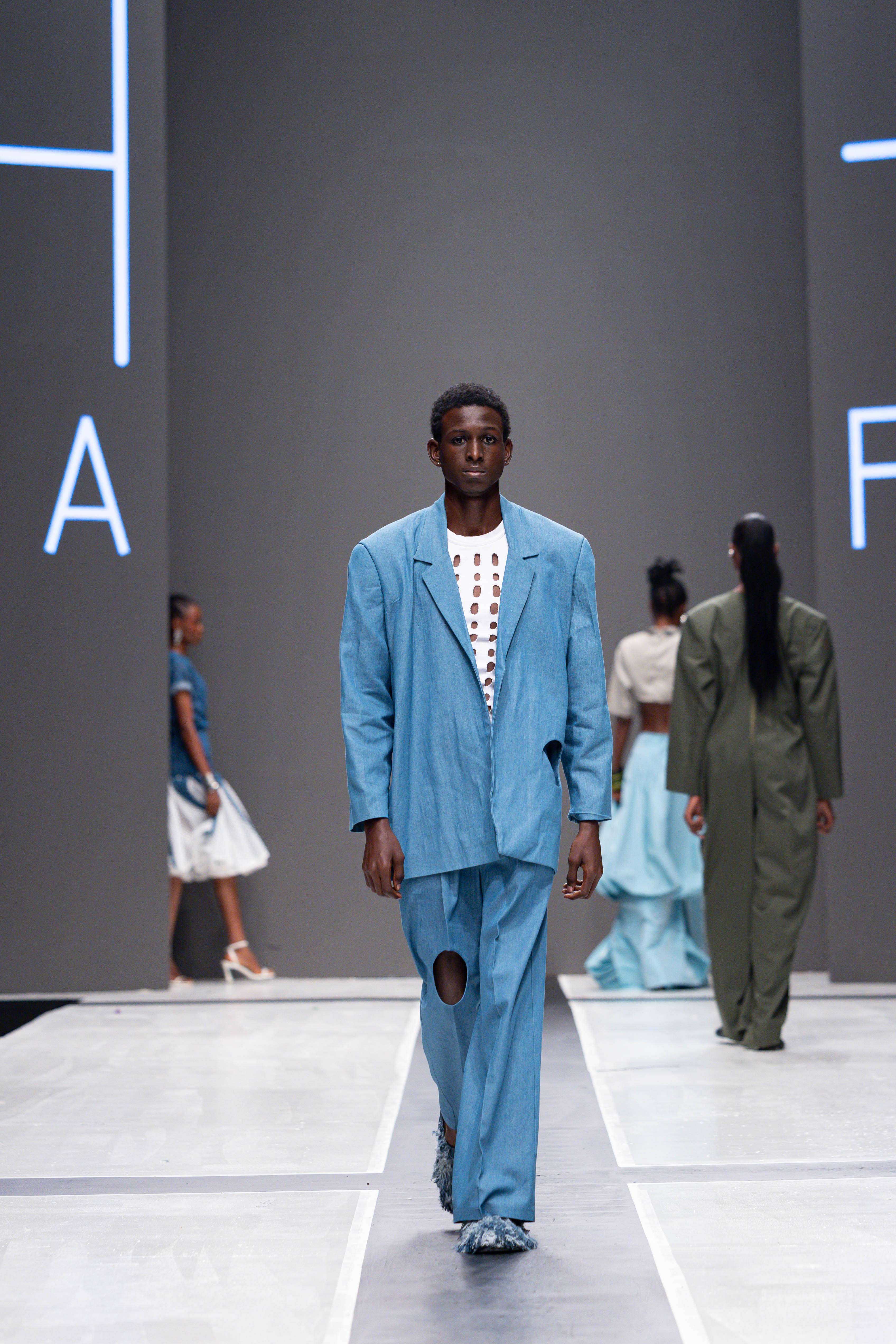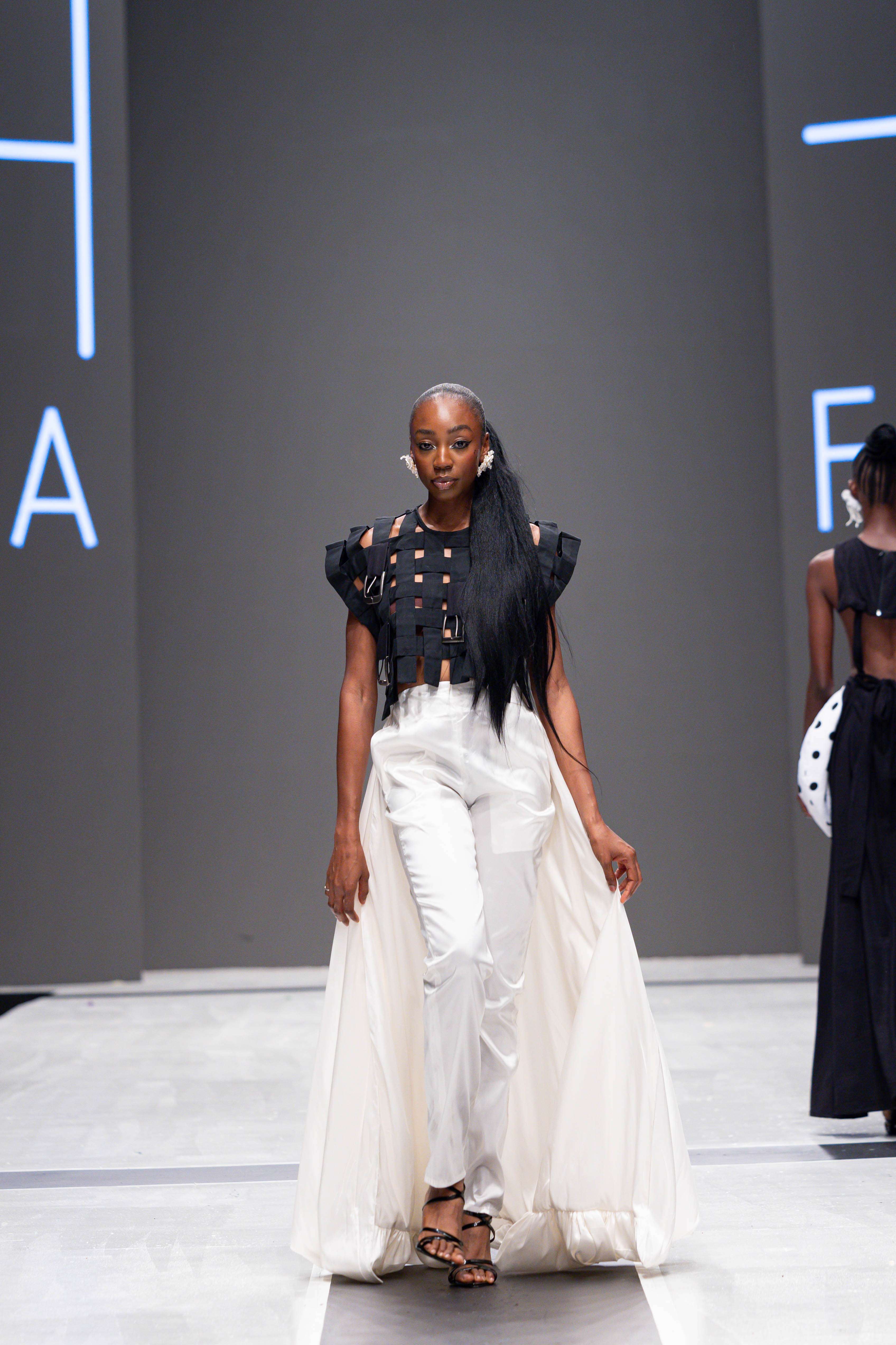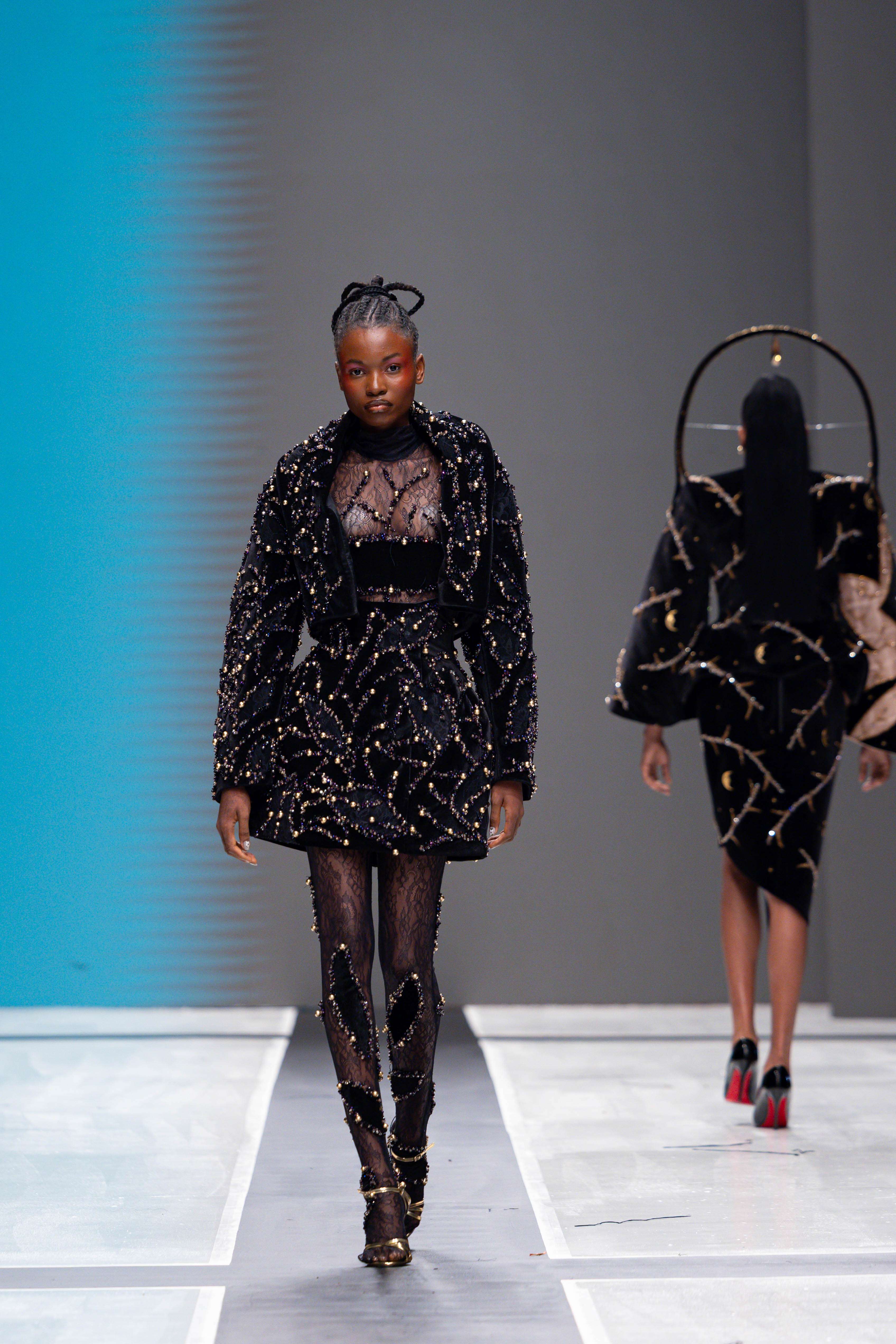 Collaborative presentations added an exciting dimension to the evening. The NIVEA x Fruché partnership unveiled a monochrome capsule collection, featuring sheer suiting and textured fringe that captivated the audience. Lush Hair transformed the runway into a visual spectacle, highlighting texture and volume, with the grand finale featuring chef Hilda Baci in a stunning flowing pink dress and sculptural afrocentric hairstyle.
