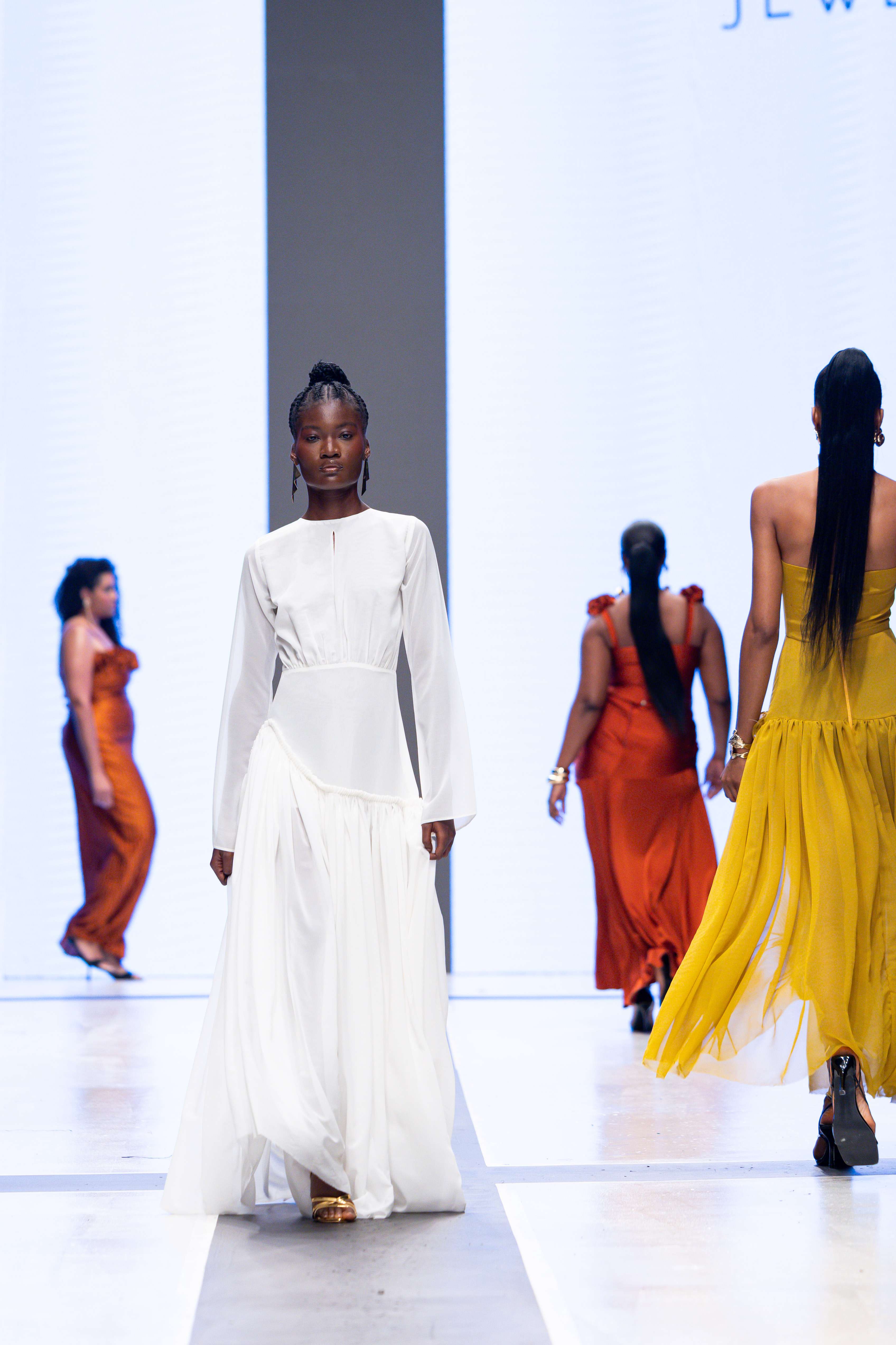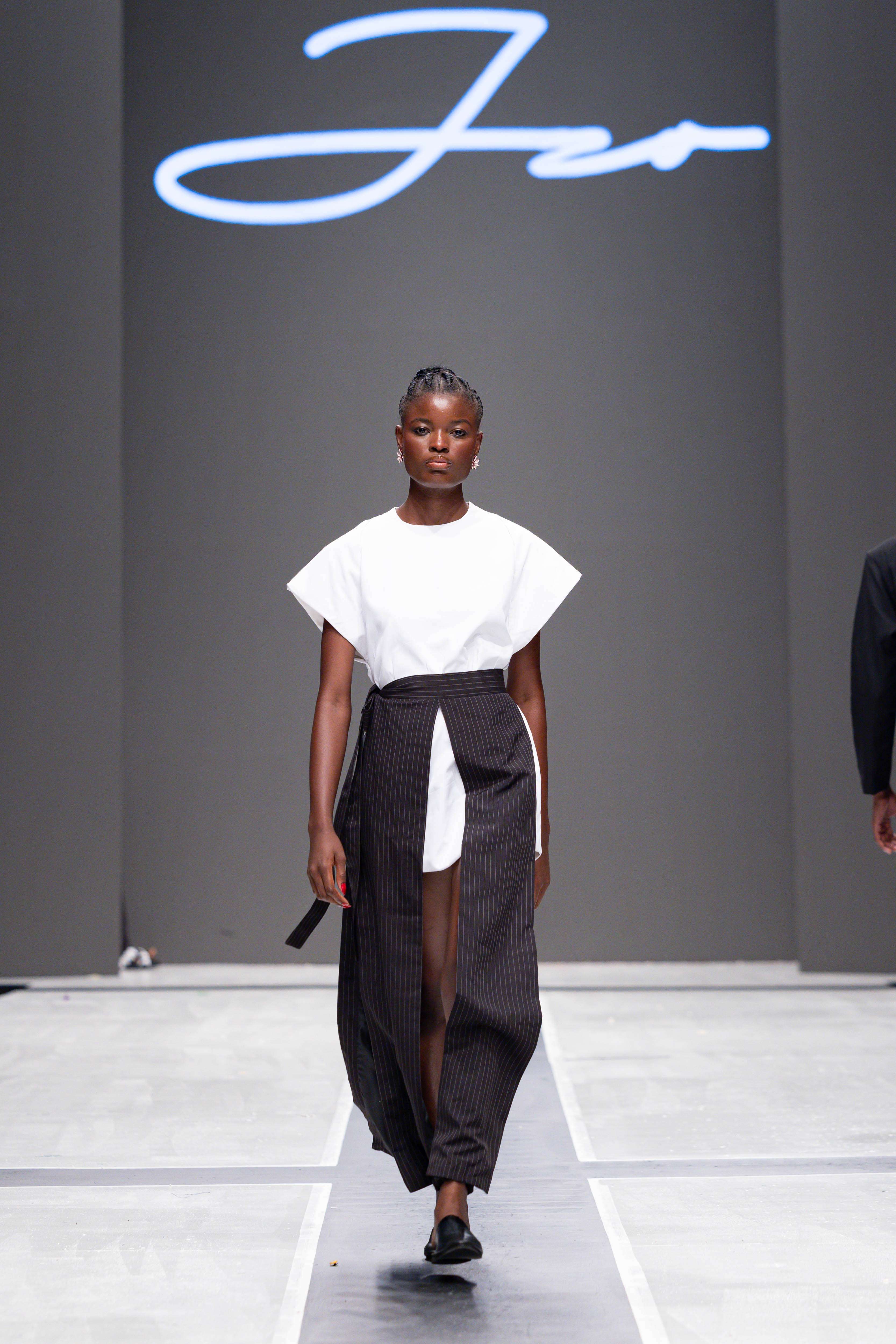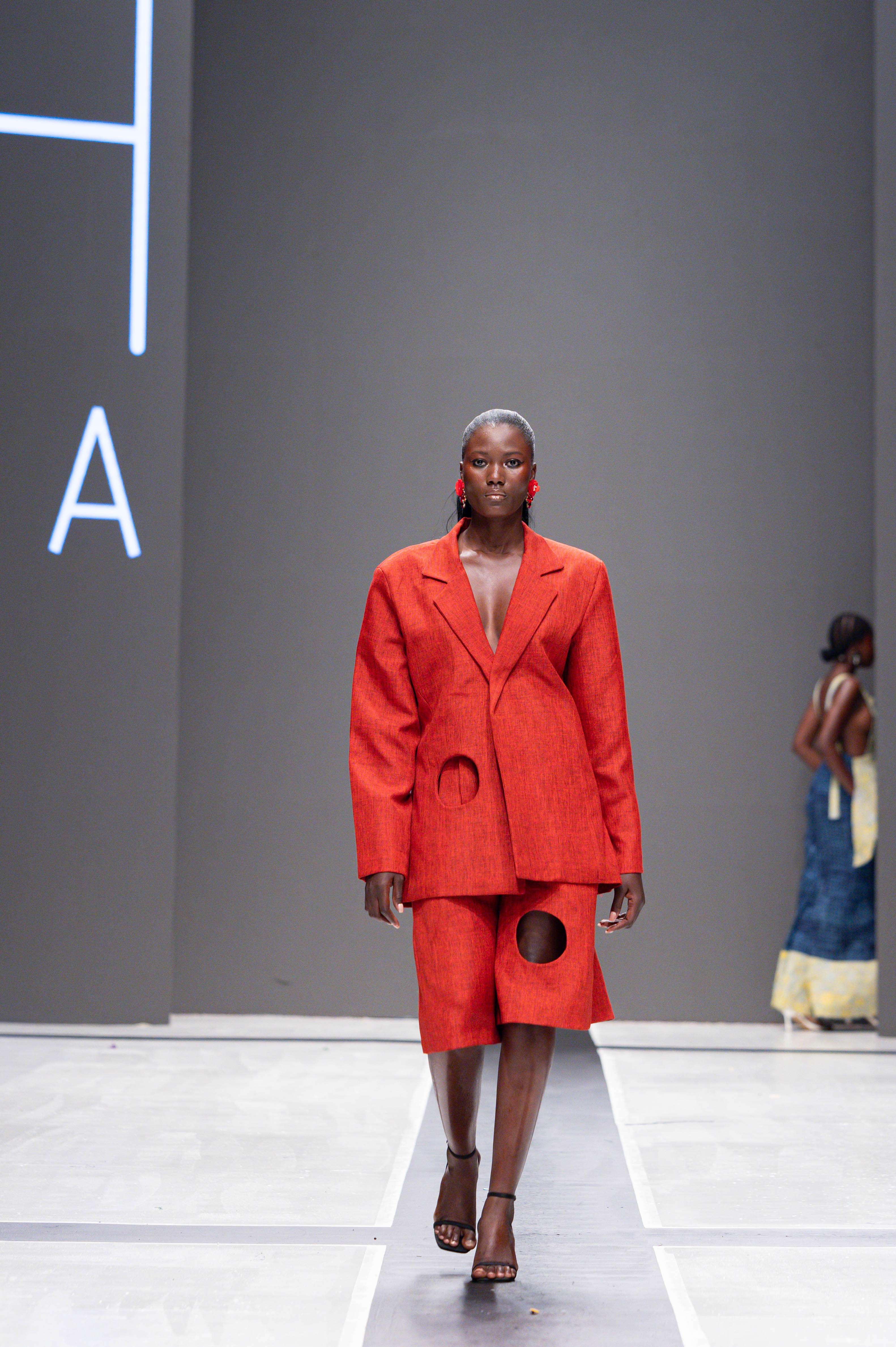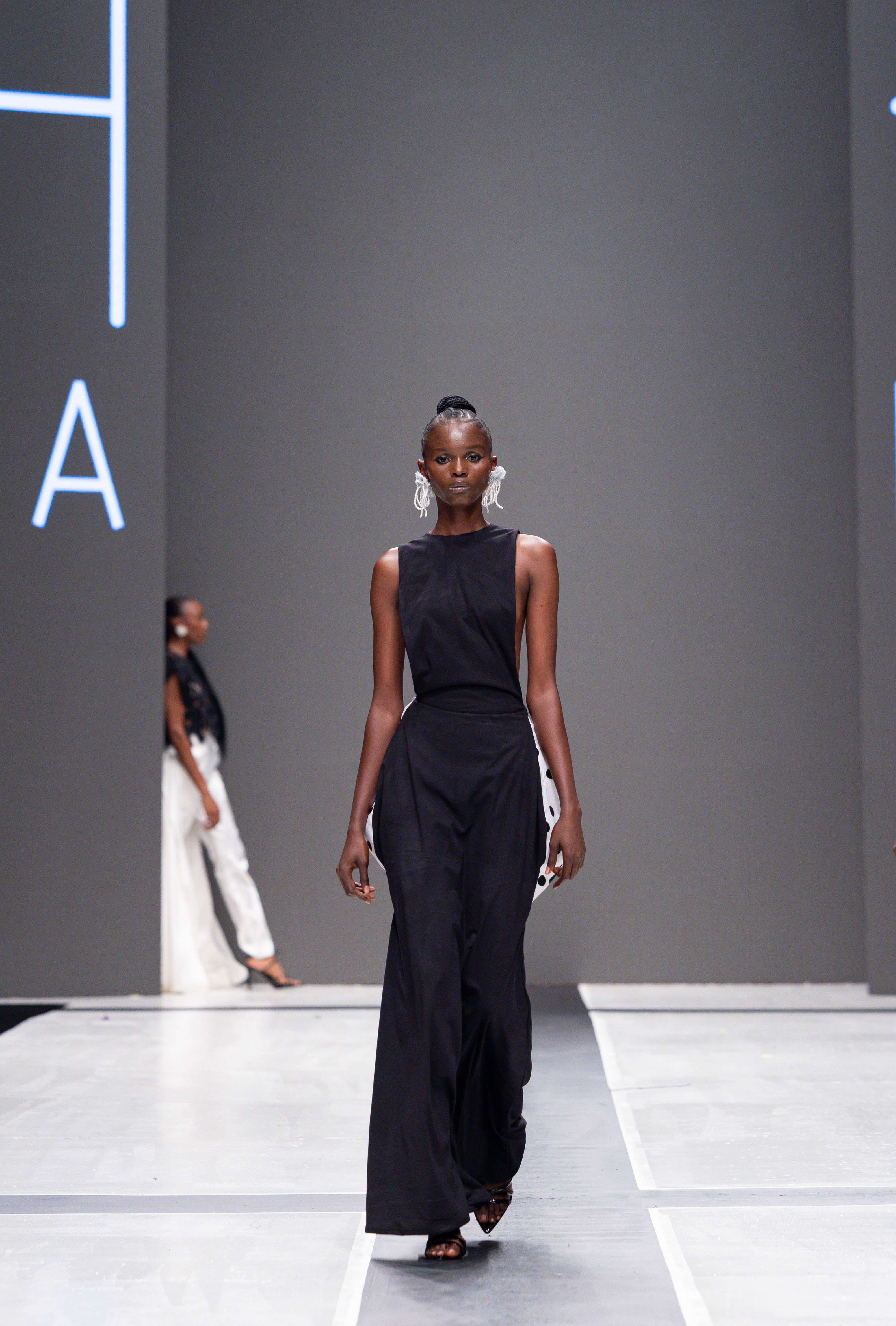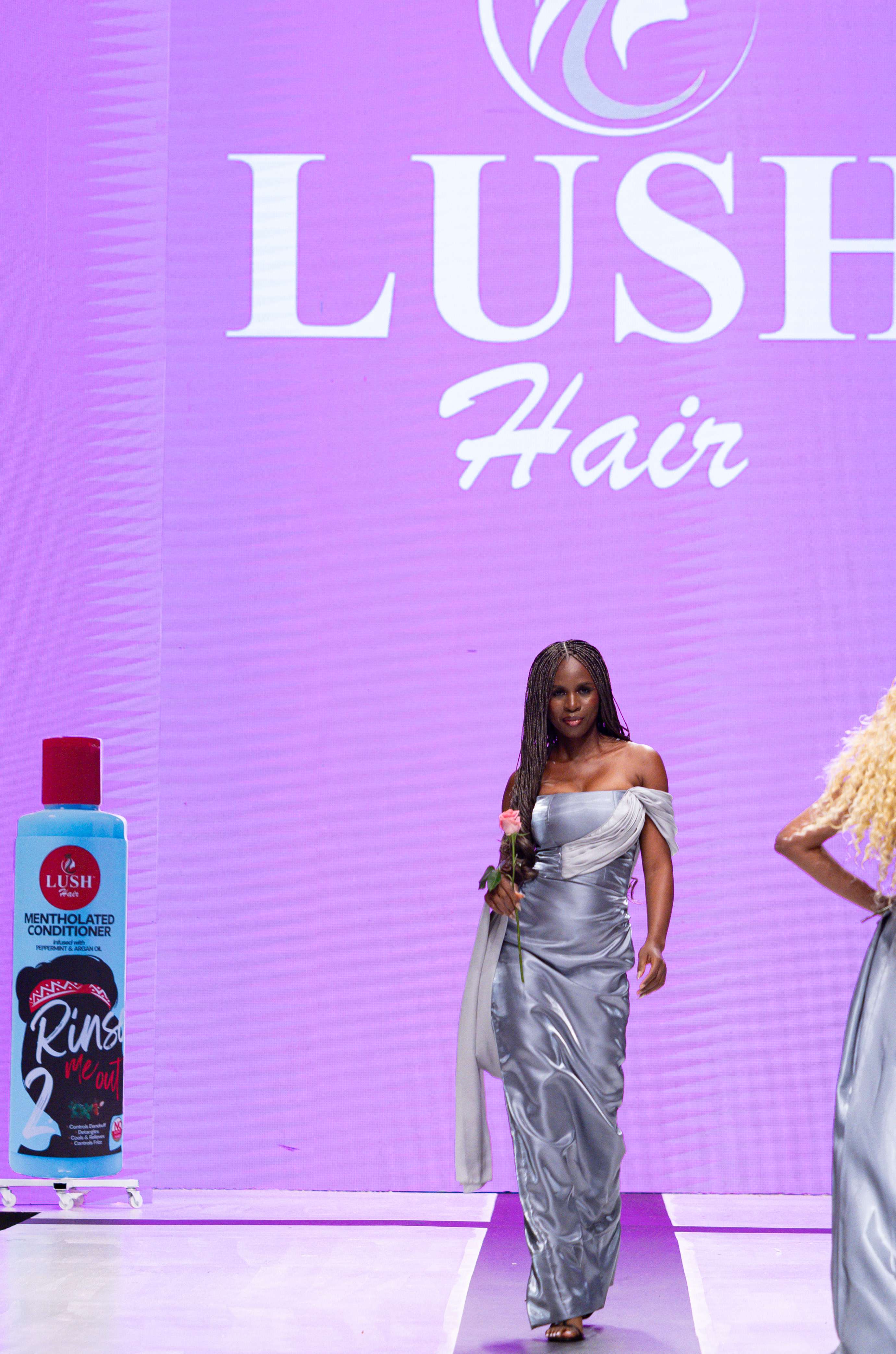 Collaborative presentations added an exciting dimension to the evening. The NIVEA x Fruché partnership unveiled a monochrome capsule collection, featuring sheer suiting and textured fringe that captivated the audience. Lush Hair transformed the runway into a visual spectacle, highlighting texture and volume, with the grand finale featuring chef Hilda Baci in a stunning flowing pink dress and sculptural afrocentric hairstyle.