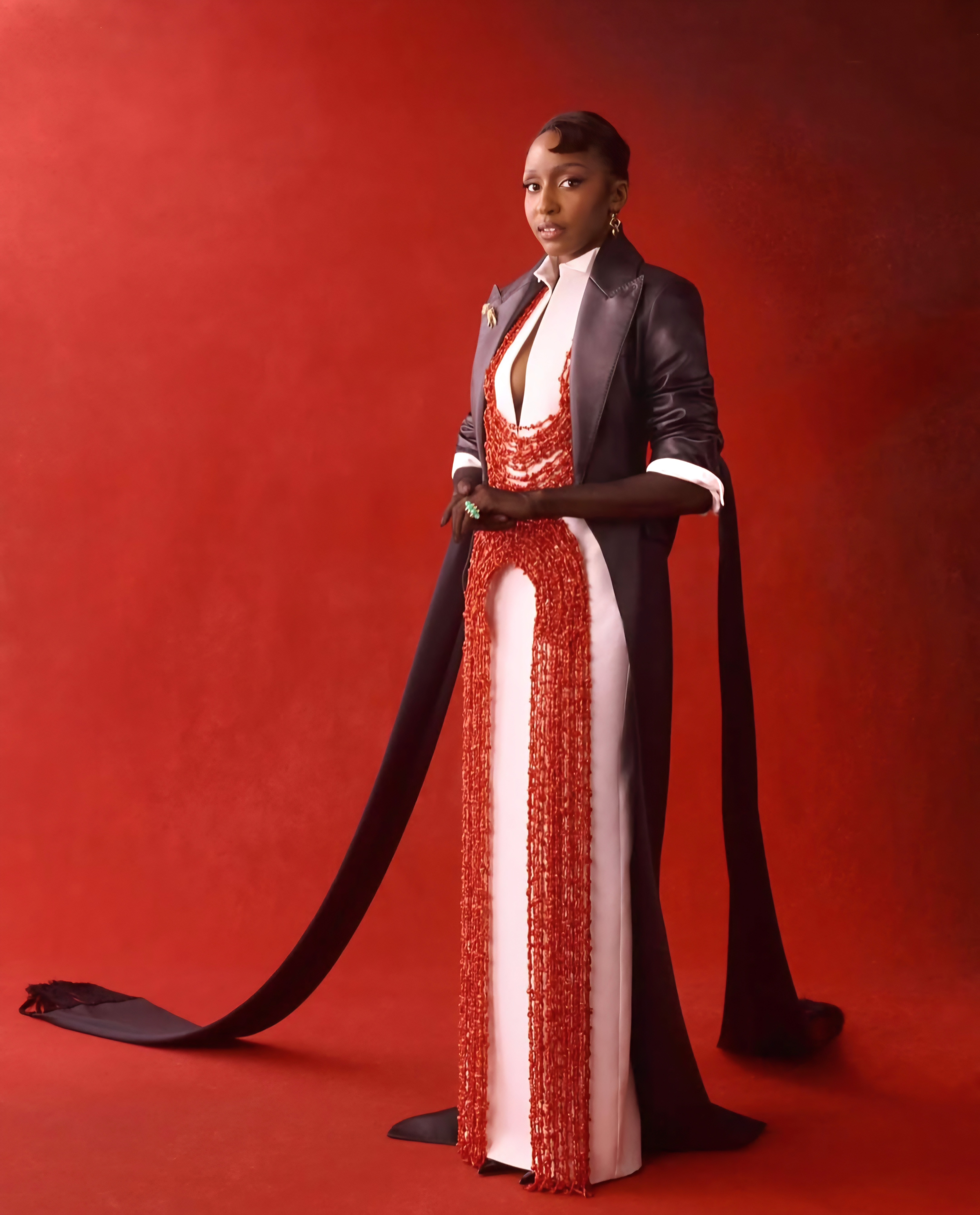 Actress Ayo Edebiri honored her Nigerian roots in a Ferragamo ensemble designed by Maximilian Davis. The look featured a white floor length collared dress, accentuated with a cluster of red Edo beads (known traditionally as ivie) draped from the neck to the waistline and cascading down the skirt. A black leather cape and sheer gloves completed the ensemble, seamlessly blending contemporary fashion with cultural heritage.