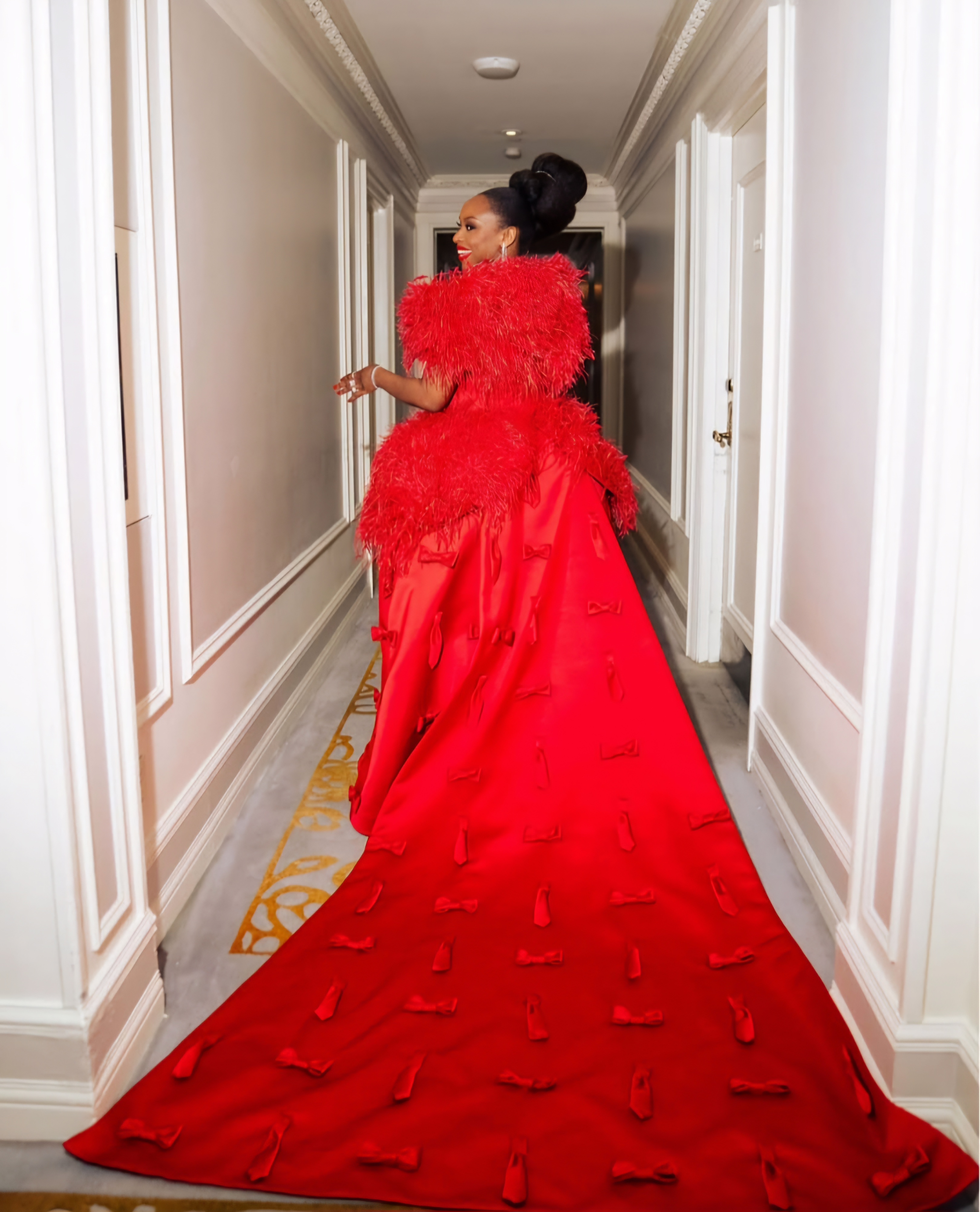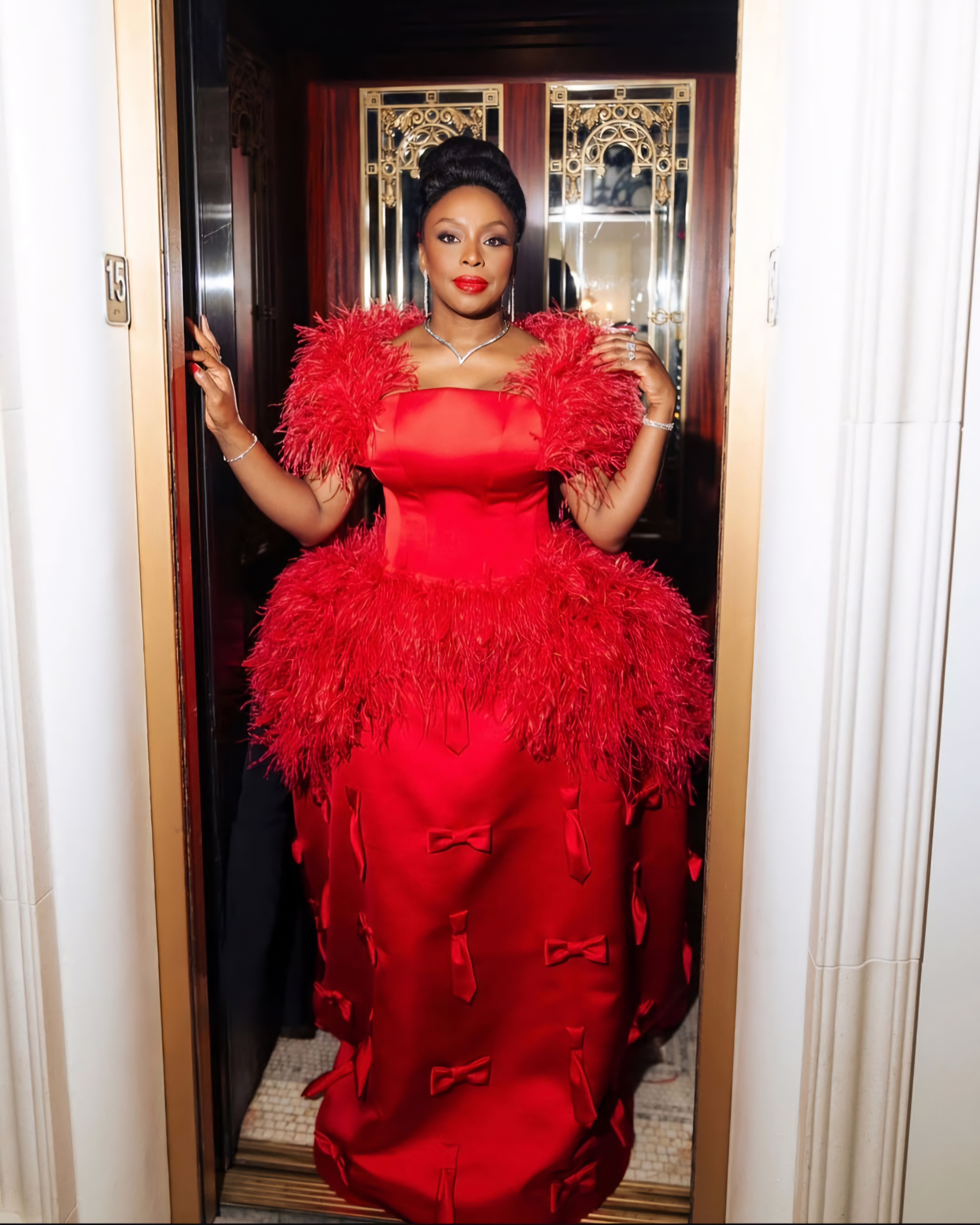 Author and activist Chimamanda Ngozi Adichie, serving on the host committee, wore a stunning red gown by Prabal Gurung. The dress was adorned with delicate feathers, mini bows, and ties, adding layers of texture and symbolism. Her presence and attire underscored her influence in both fashion and culture.