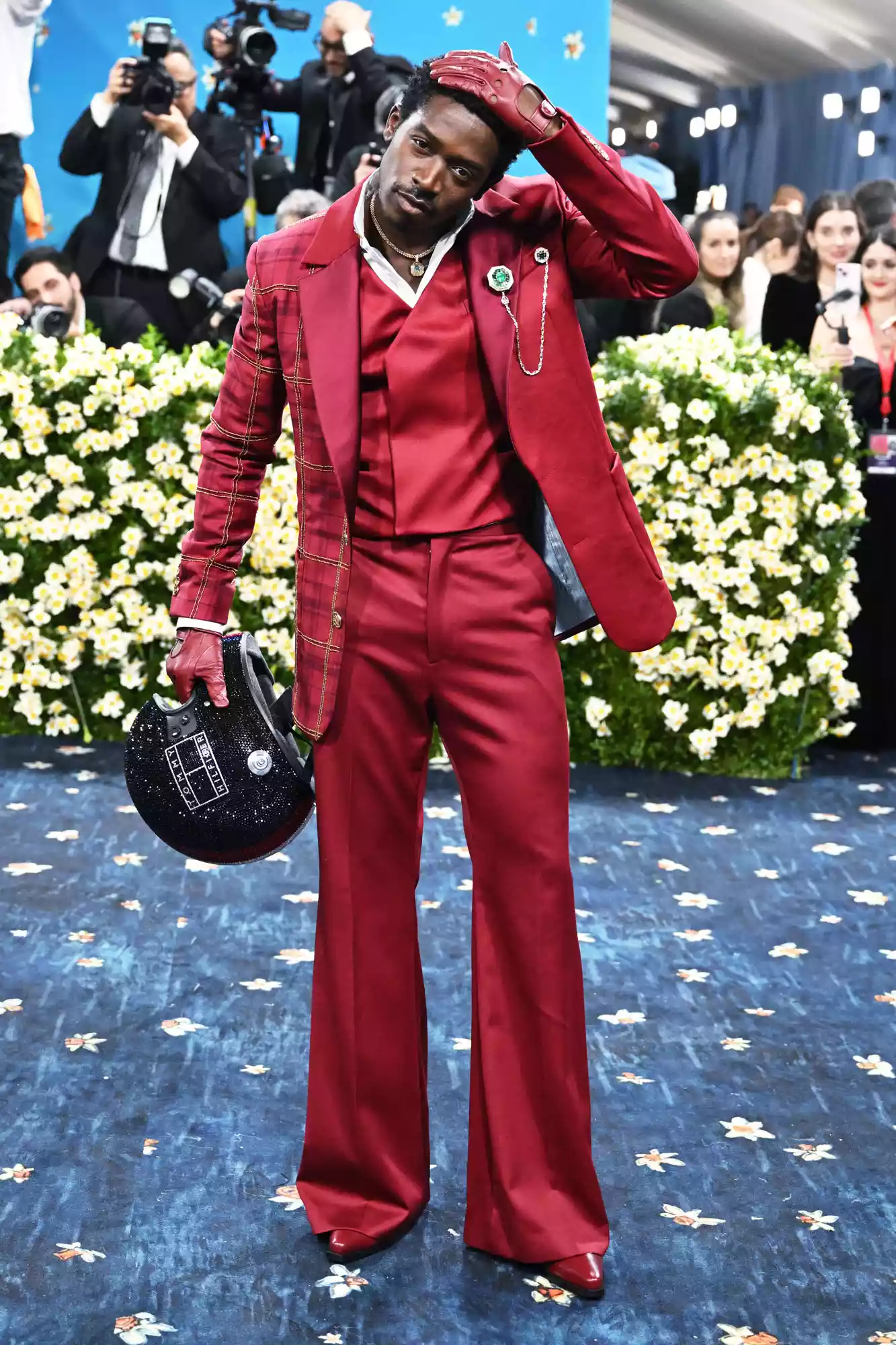 Actor Damson Idris made a dramatic entrance at the Met Gala, arriving in a Formula 1 race suit complete with a helmet, before revealing a tailored red plaid three piece suit by Tommy Hilfiger with gold accents. The ensemble merged classic American style with his Nigerian heritage, reflecting the evening’s theme by showcasing the evolution of Black tailoring.