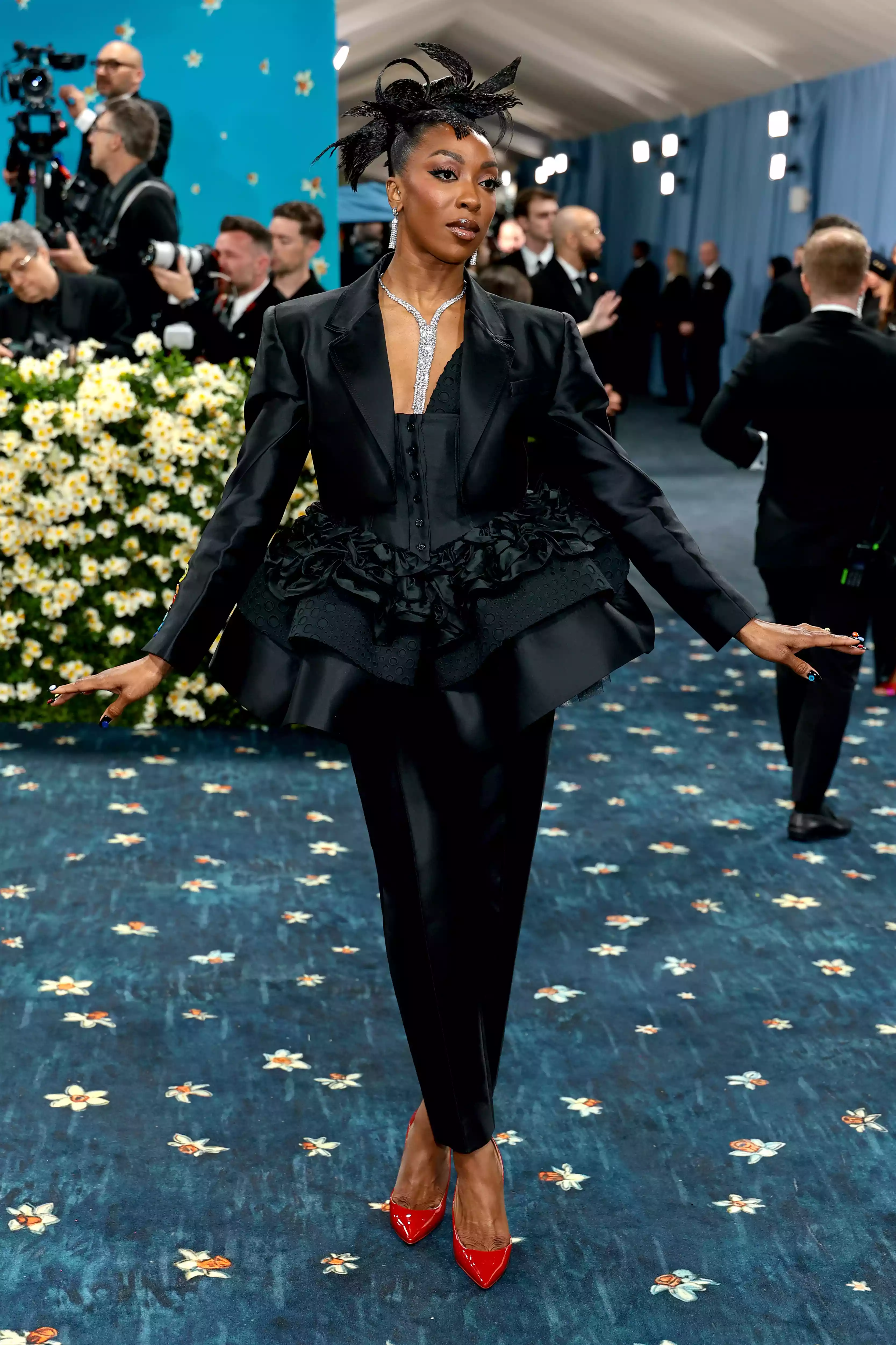 Comedian and actress Ego Nwodim made her Met Gala debut in a playful three piece black suit by Christopher John Rogers. The ensemble featured a cropped jacket with shoulder pads, a ruffled peplum corset, ankle length pants, and rainbow colored sleeve buttons. She completed the look with red patent leather pumps and a diamond necklace, embodying the gala’s celebration of Black dandyism.