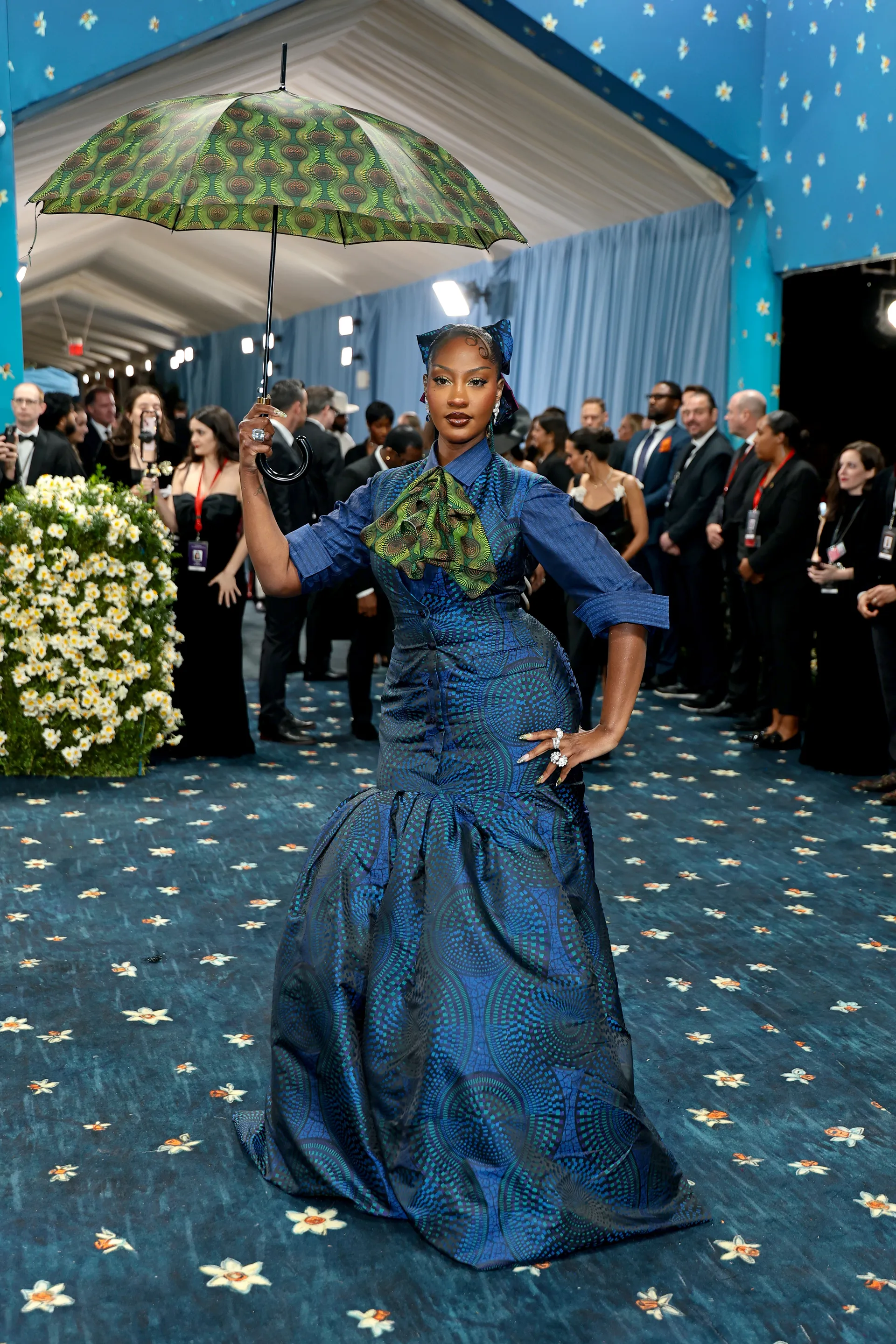 Tems graced the Met Gala in a custom Ozwald Boateng ensemble that harmoniously blended traditional African textiles with contemporary tailoring. Her deep blue shirt dress featured subtle Ankara prints, complemented by a matching green ankara necktie, hair ribbon, and umbrella. This look paid homage to Boateng’s 2019 debut womenswear collection at New York’s Apollo Theater, reimagined through Tems’ unique lens.