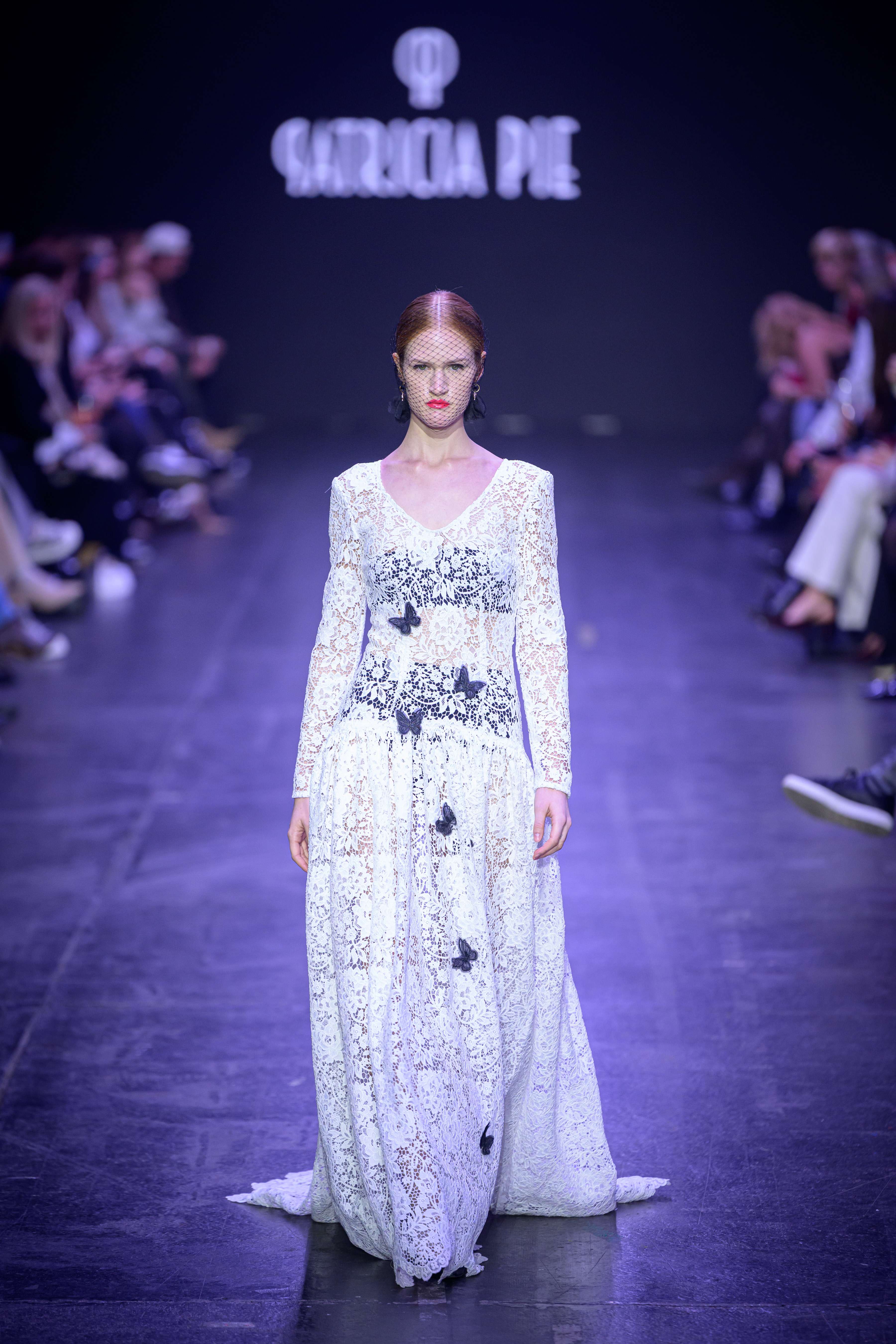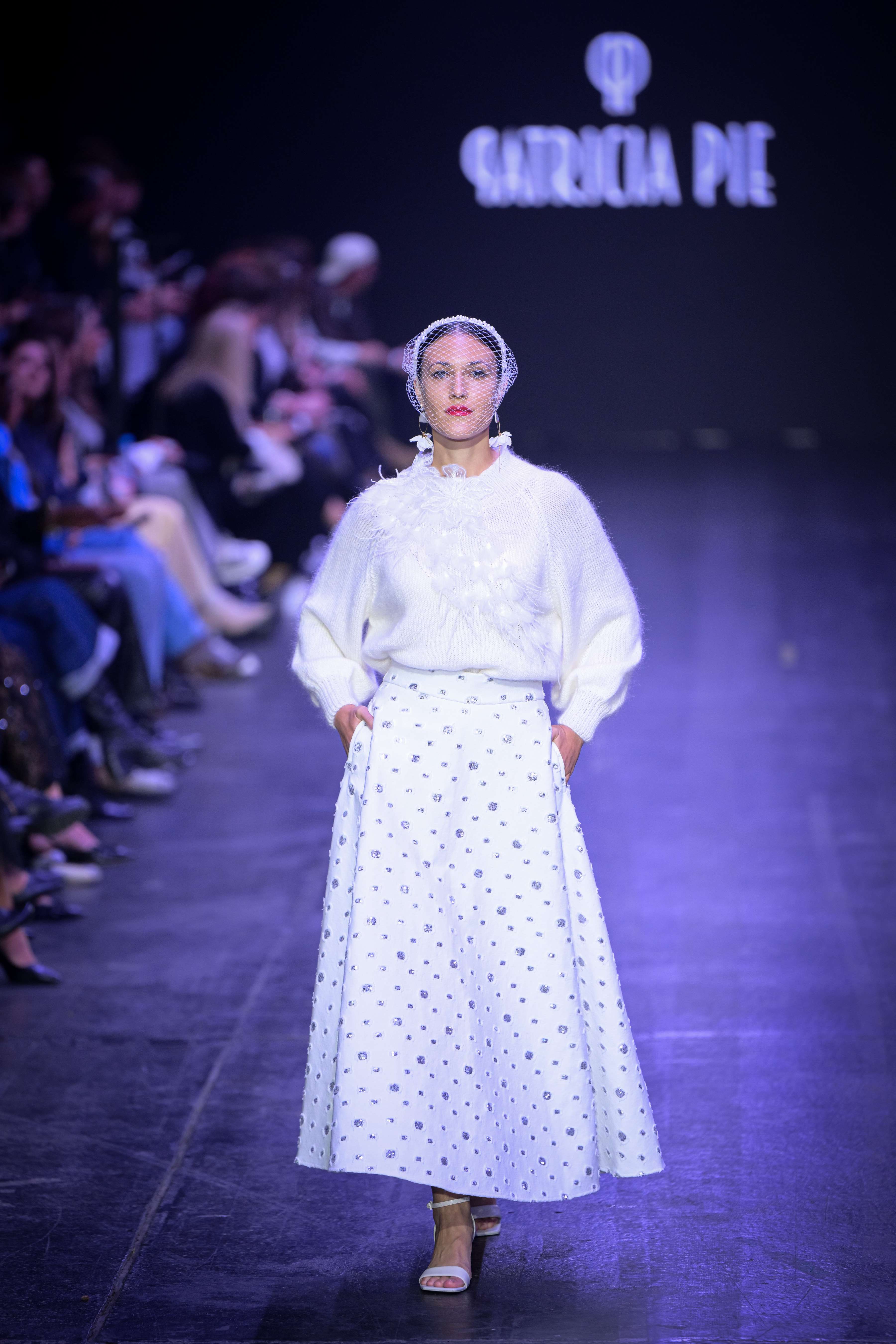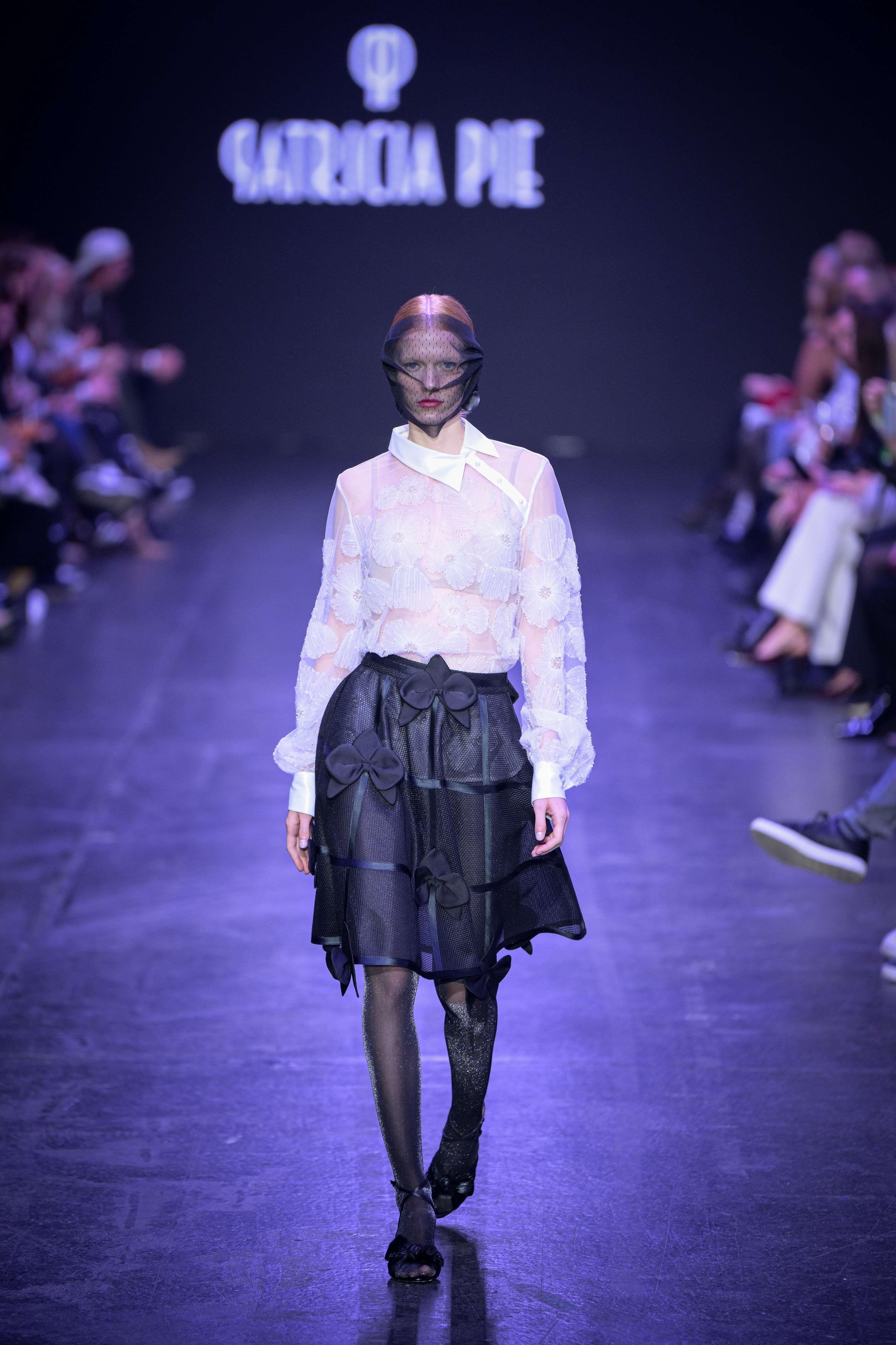 Next, Patricia Pie presents “Symphonia,” a daring exploration of monochromatic black and white, accented with gold and silver touches. This collection highlights the atelier’s extensive skills, featuring luxurious fabrics and intricate 3D embellishments. “Symphonia” merges everyday sophistication with formal elegance, showcasing a range of garments that embody sustainability through innovative materials such as biodegradable lotus fiber and fabrics derived from orange peels. Accompanied by live musical performances, this collection celebrates the emotional journey of fashion while honouring the environment.