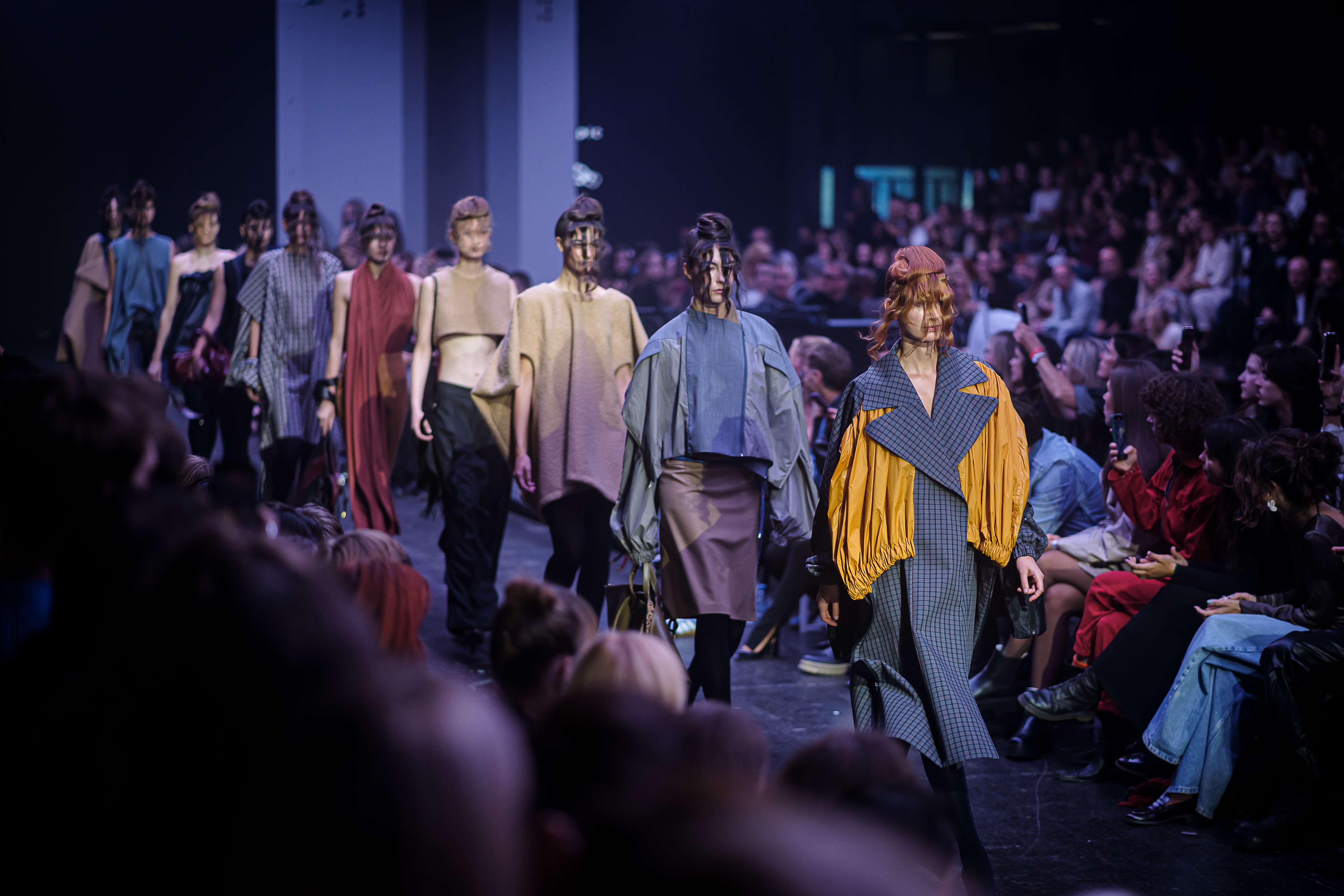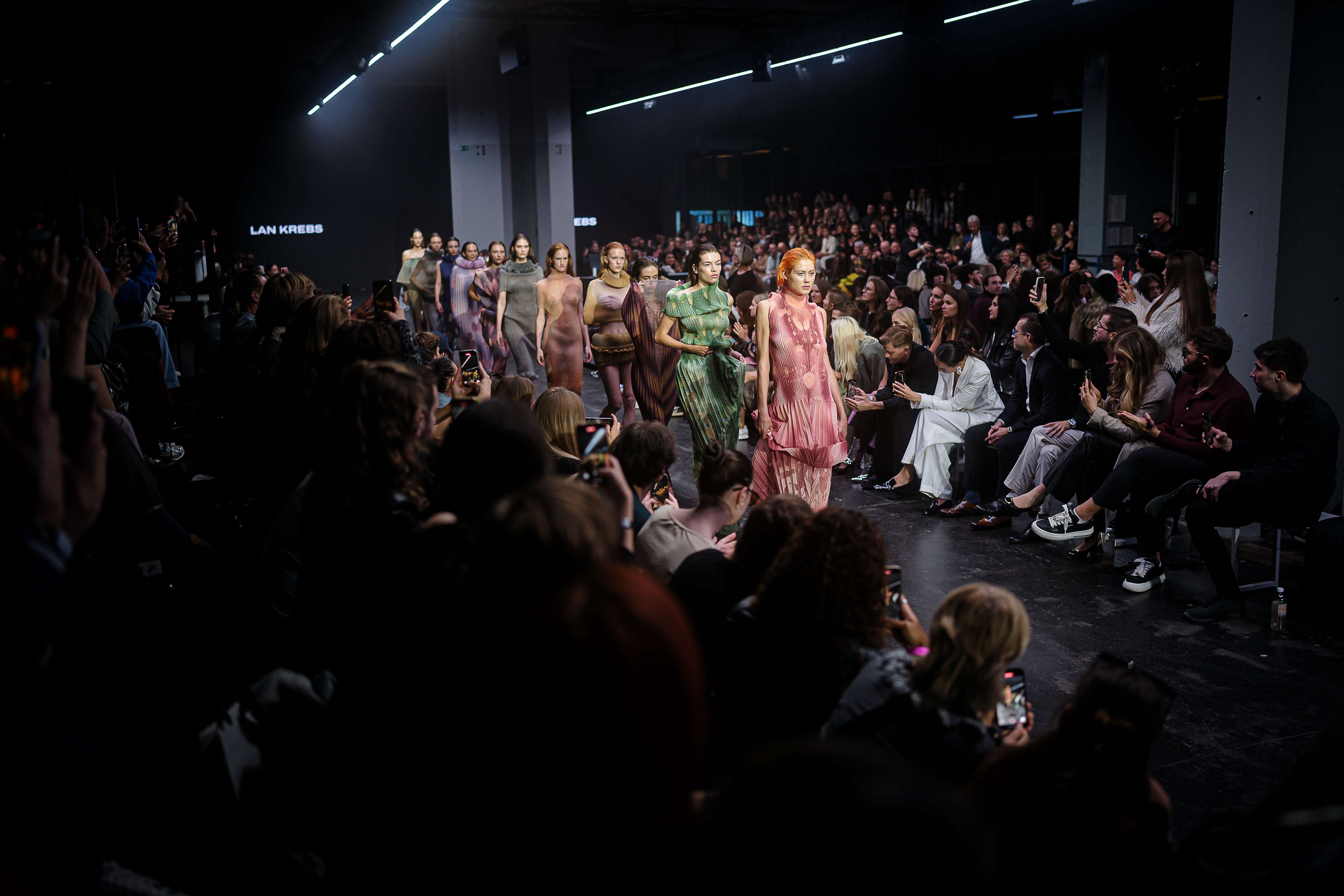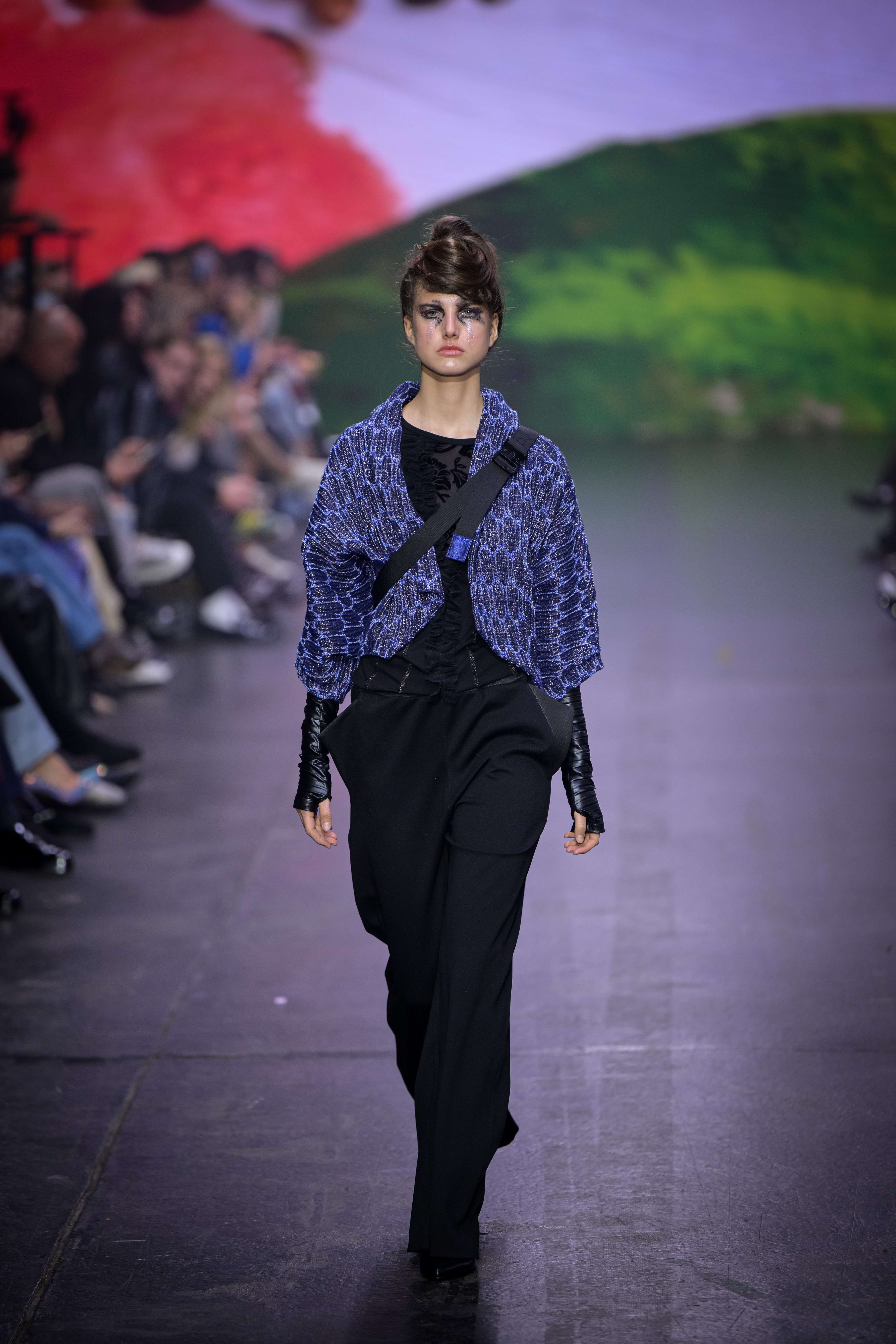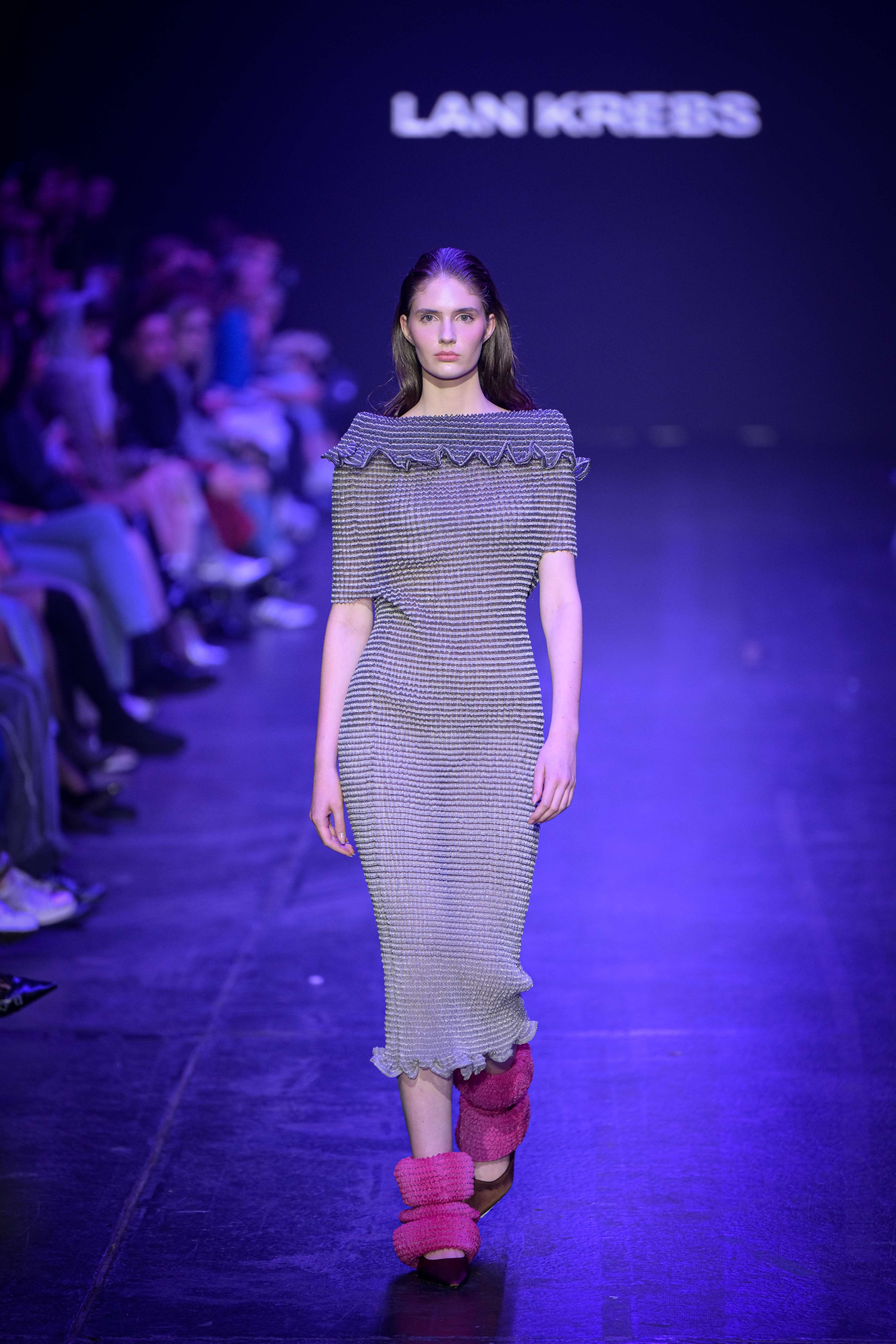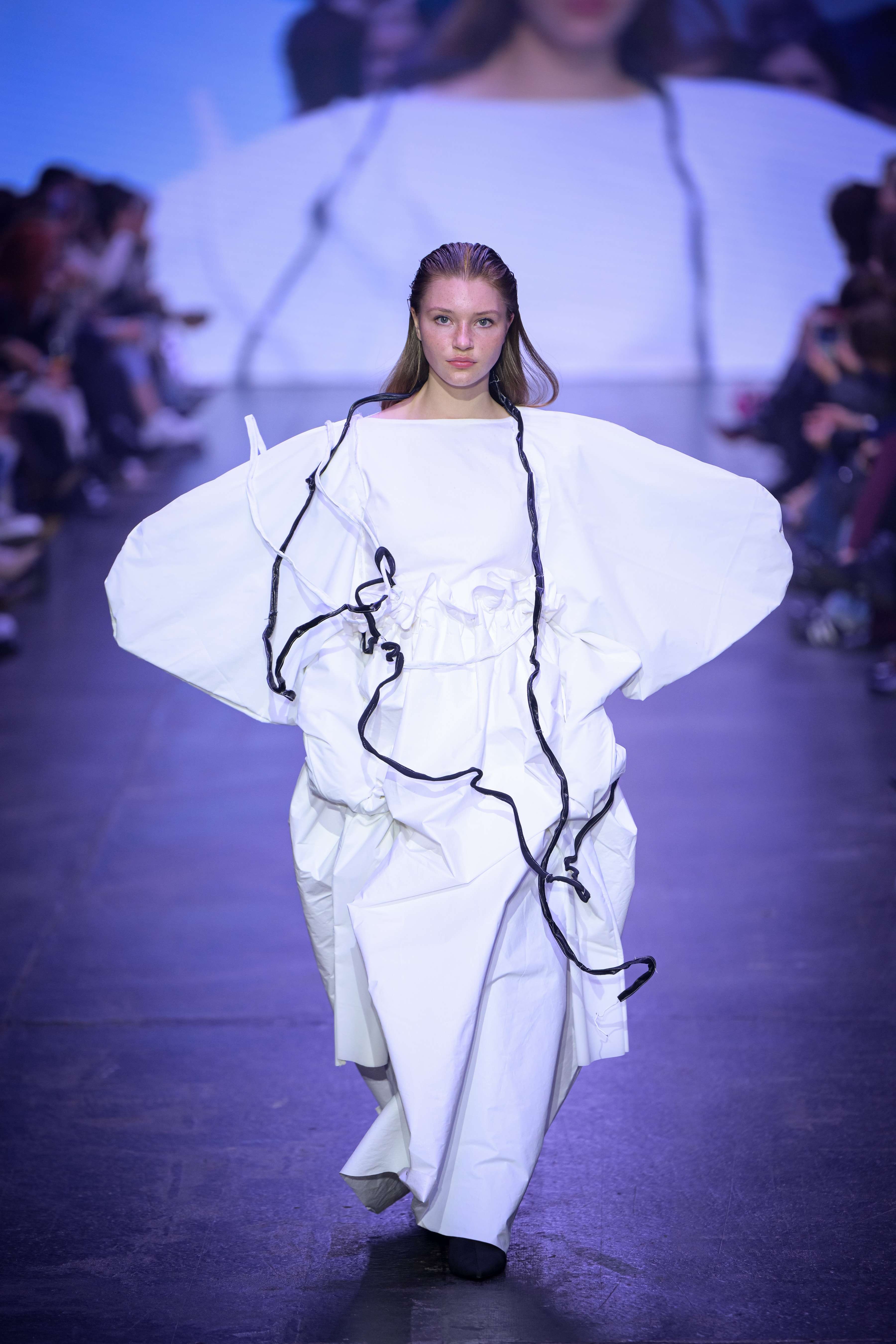 Lan Krebs wraps up Day Two with a reimagining of the humble jersey fabric in his collection “Single Jersey.” By exploring the potential of tubular knits, Lan creates sculptural garments that invite interaction and individual interpretation. His pieces challenge conventional garment structures, emphasising sustainability through minimal material intervention. Each creation showcases the transformative power of overlooked fabrics, pushing the boundaries of contemporary design while reflecting a commitment to innovation and craftsmanship. Read More on Lan here